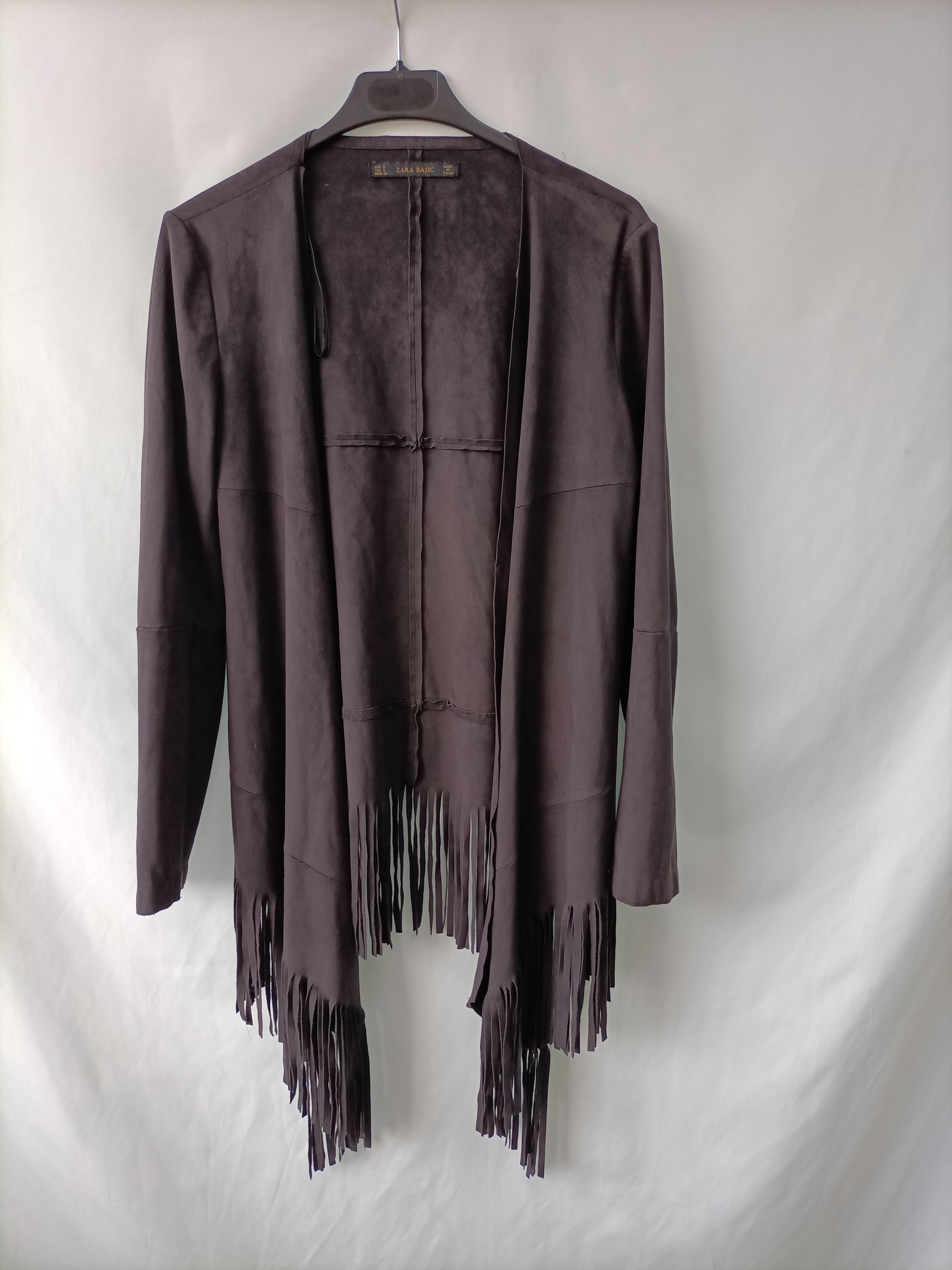 Chaqueta negra fluda de antelina con flecos. Elastica. Largo 73 cm