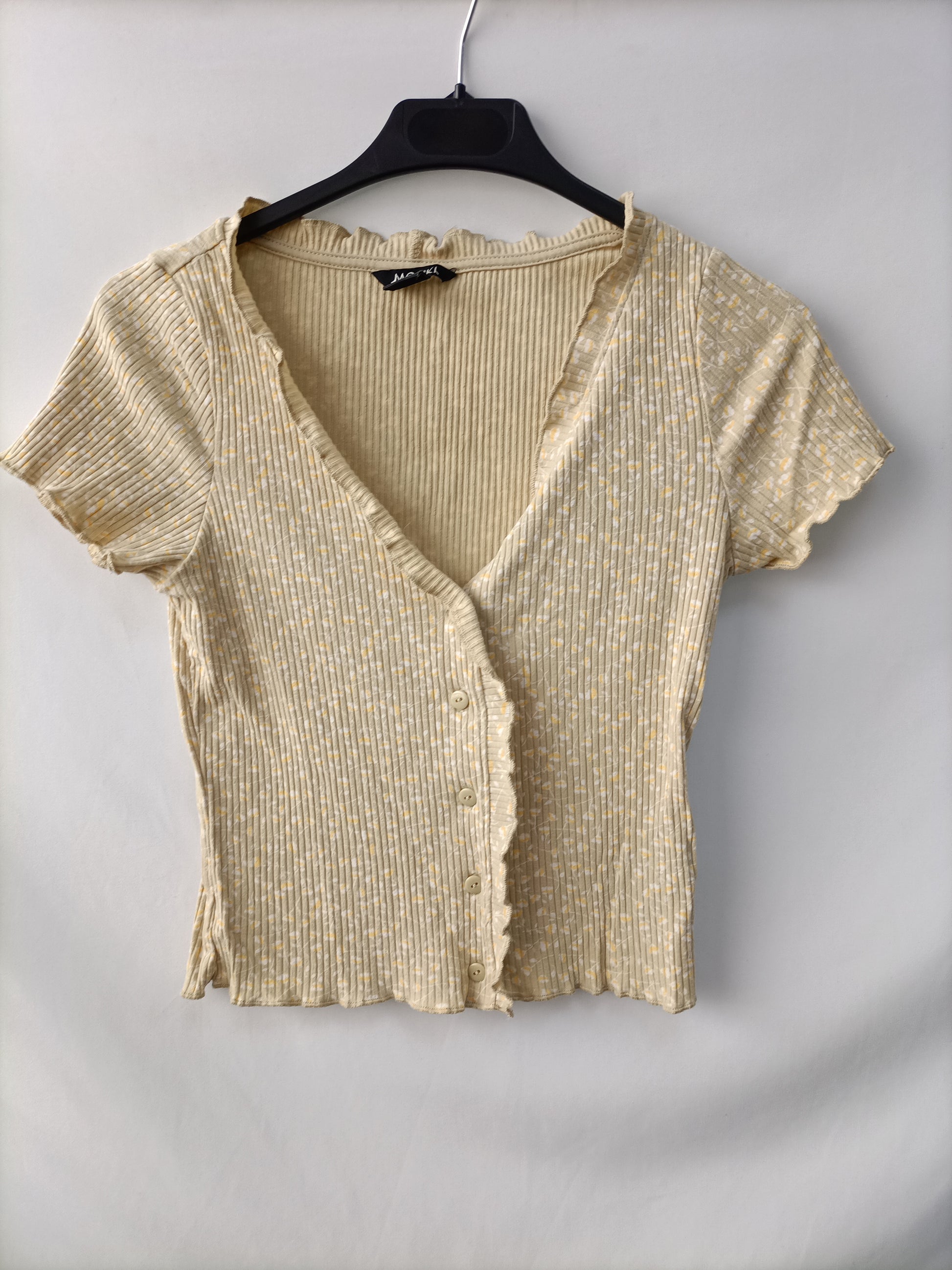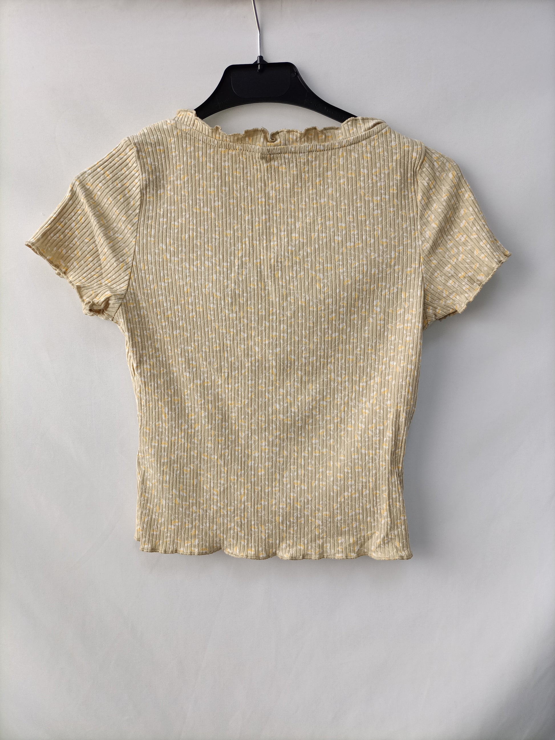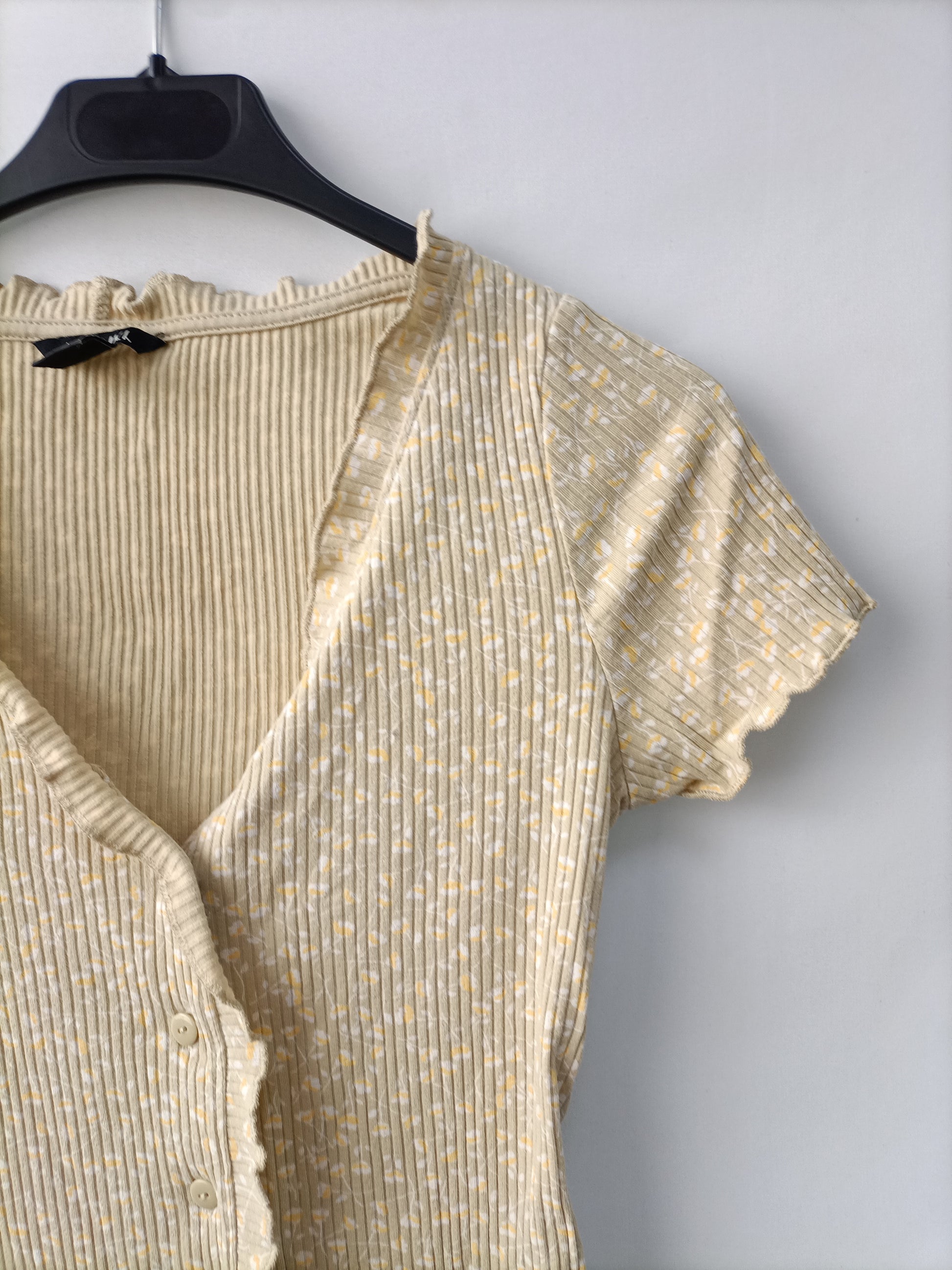 Top abotonado de canalé con florecitas fencolo amarillo verdoso. largo 44 cm.