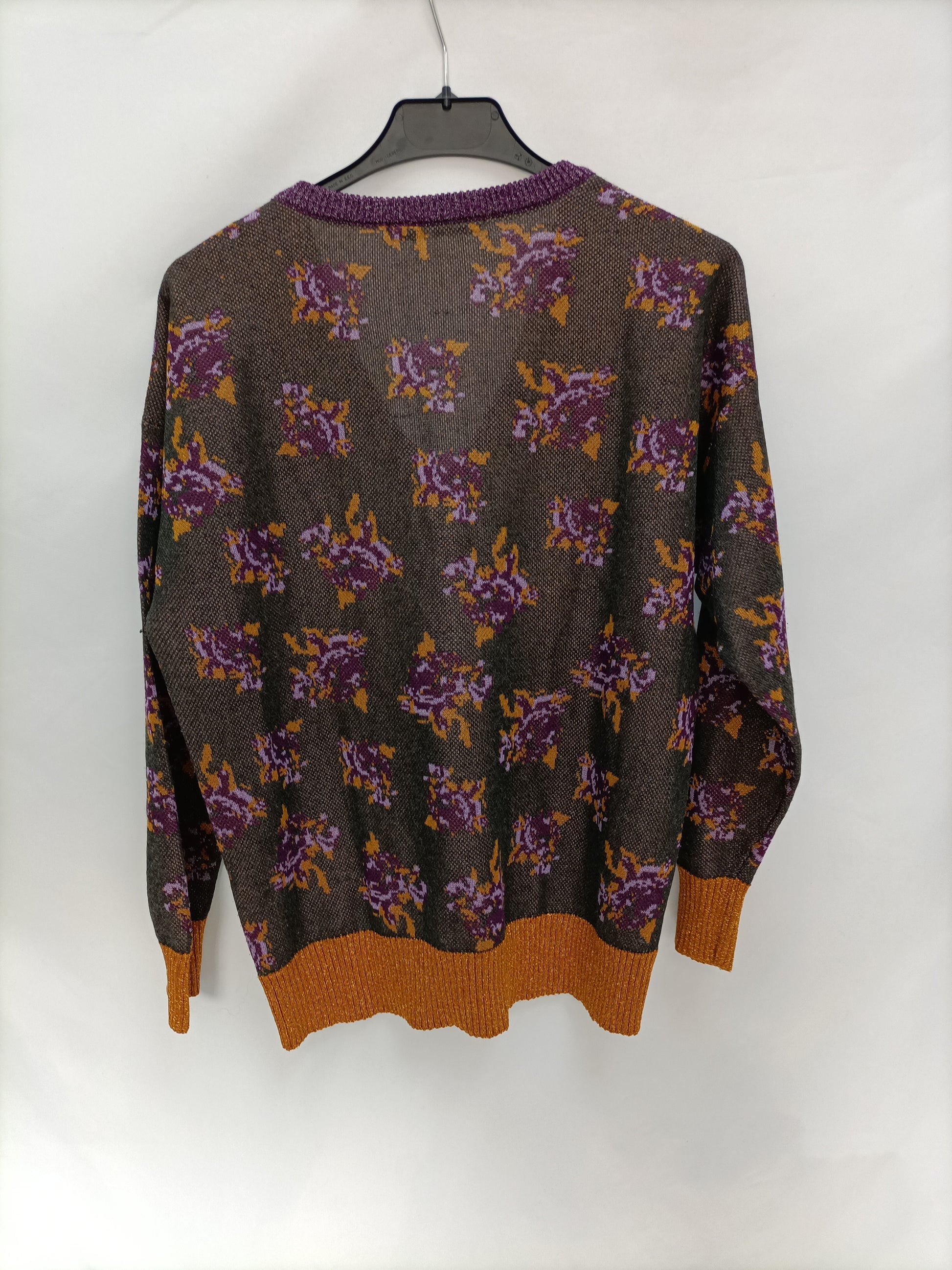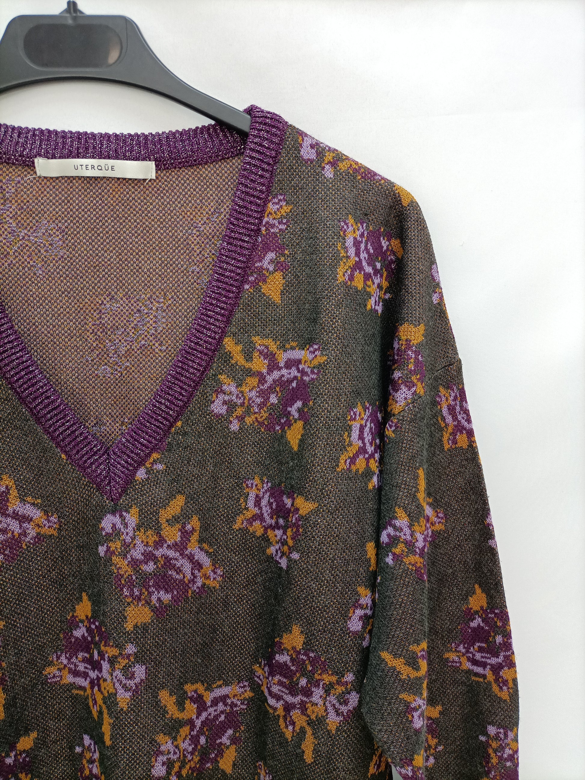 Jersey cuello pico.Estampado burdeos y hilos metálicos. largo 61 cm