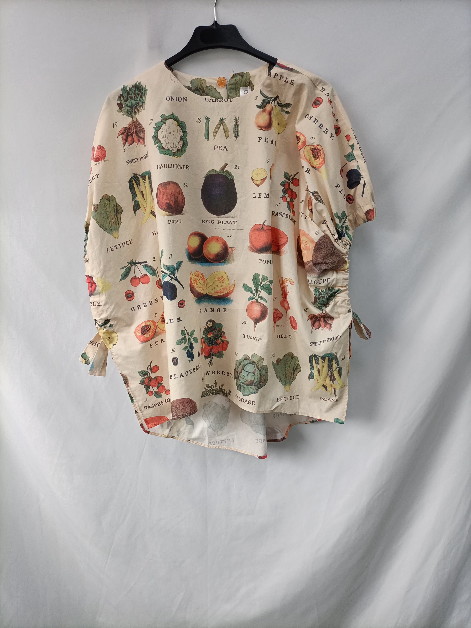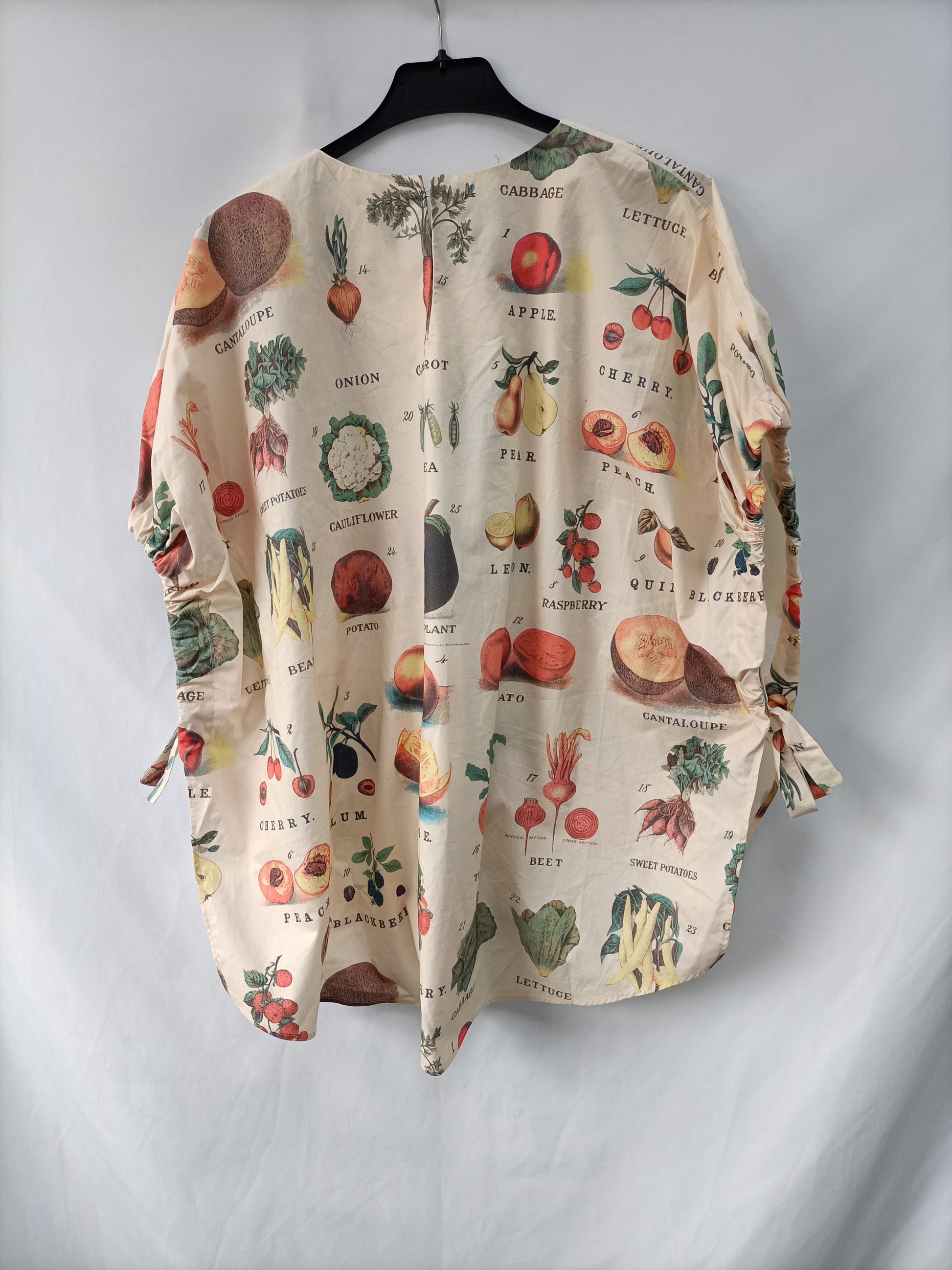 Blusa beige oversized con estampado de hortalizas y frutas. Aperturas laterales. Largo 71 cm