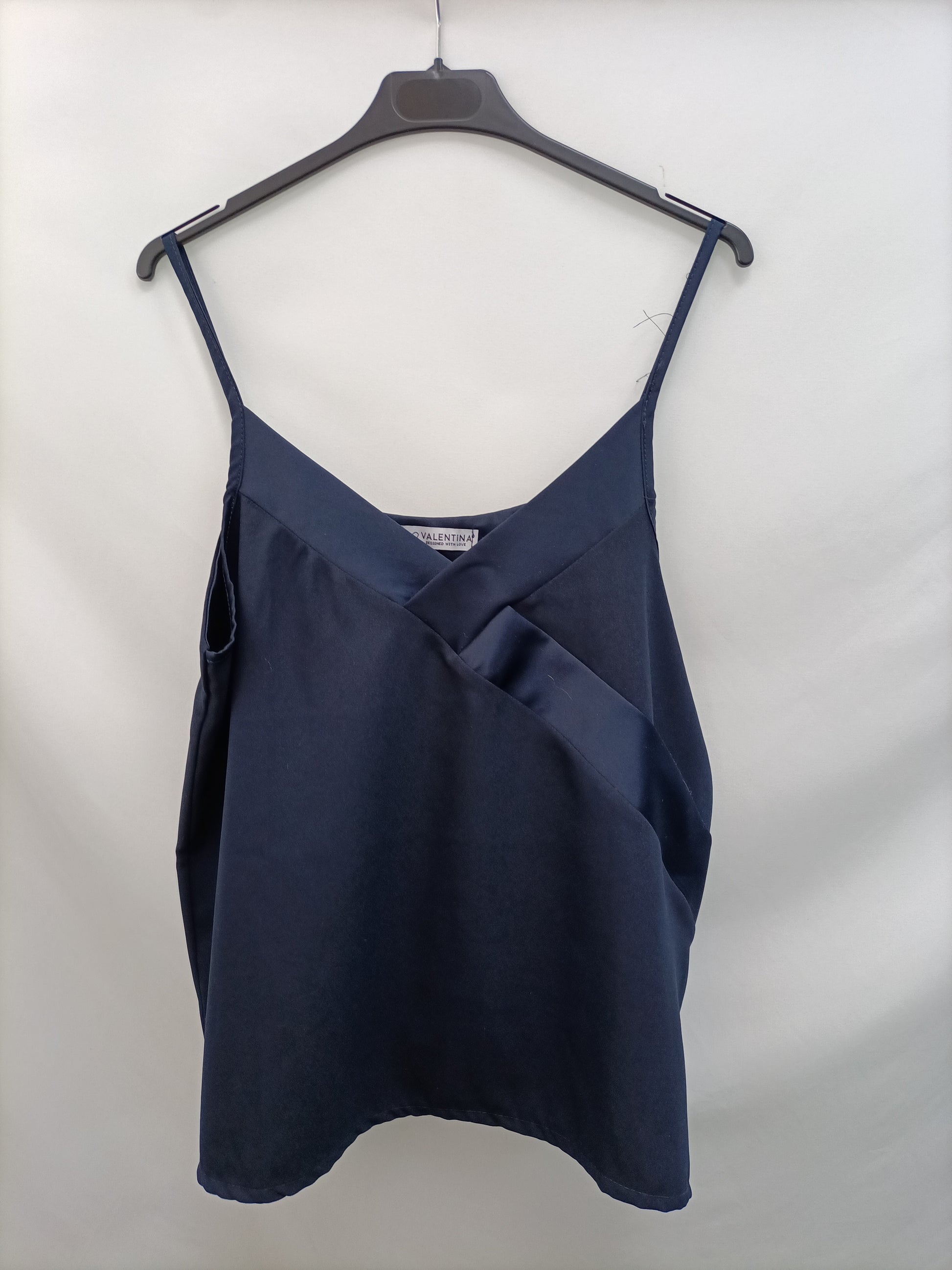top estilo lenceo azul con estalles de raso en el escote. De sisa a sisa 50 cm Largo 63 cm
