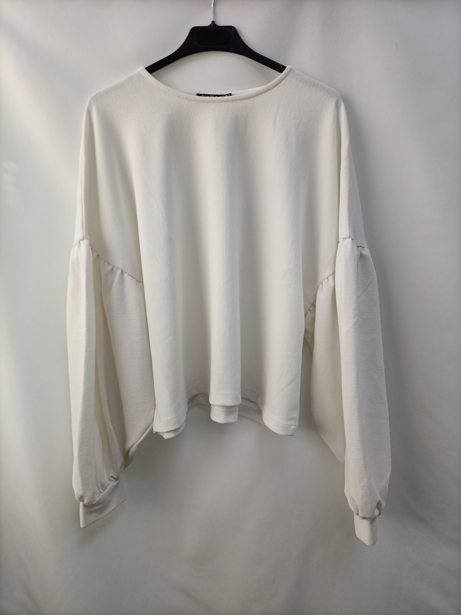 Sudadera/top blanco de canalé con las mangas super Abullonadas. Largo 52 cm