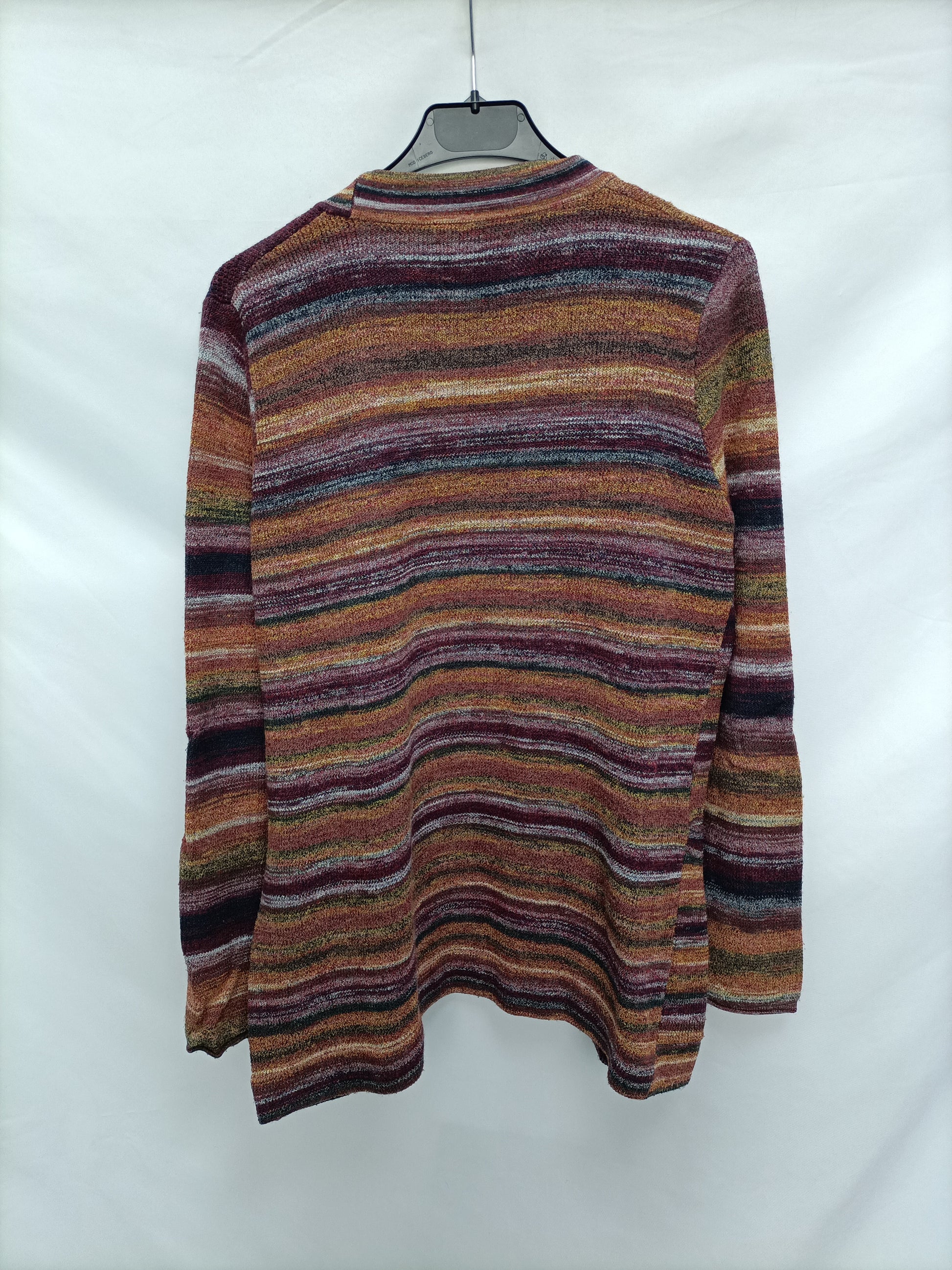 Cárdigan de rayas en tonos tierra. Elastico. No se abrocha. Largo 68 cm