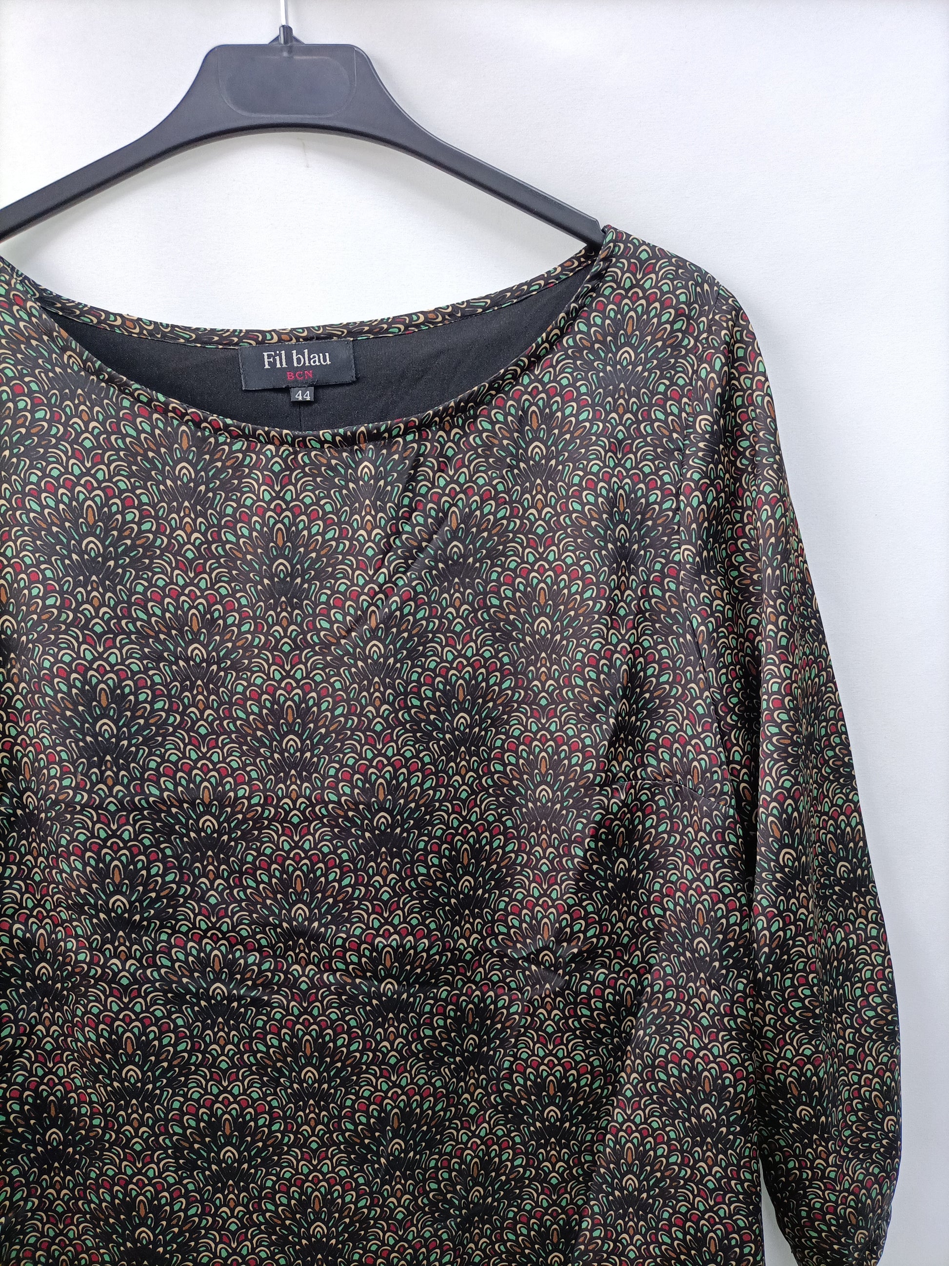 Vestido corto negro con estampado nde colores. no elástico. De sisa a sisa 47 Largo 85 cm