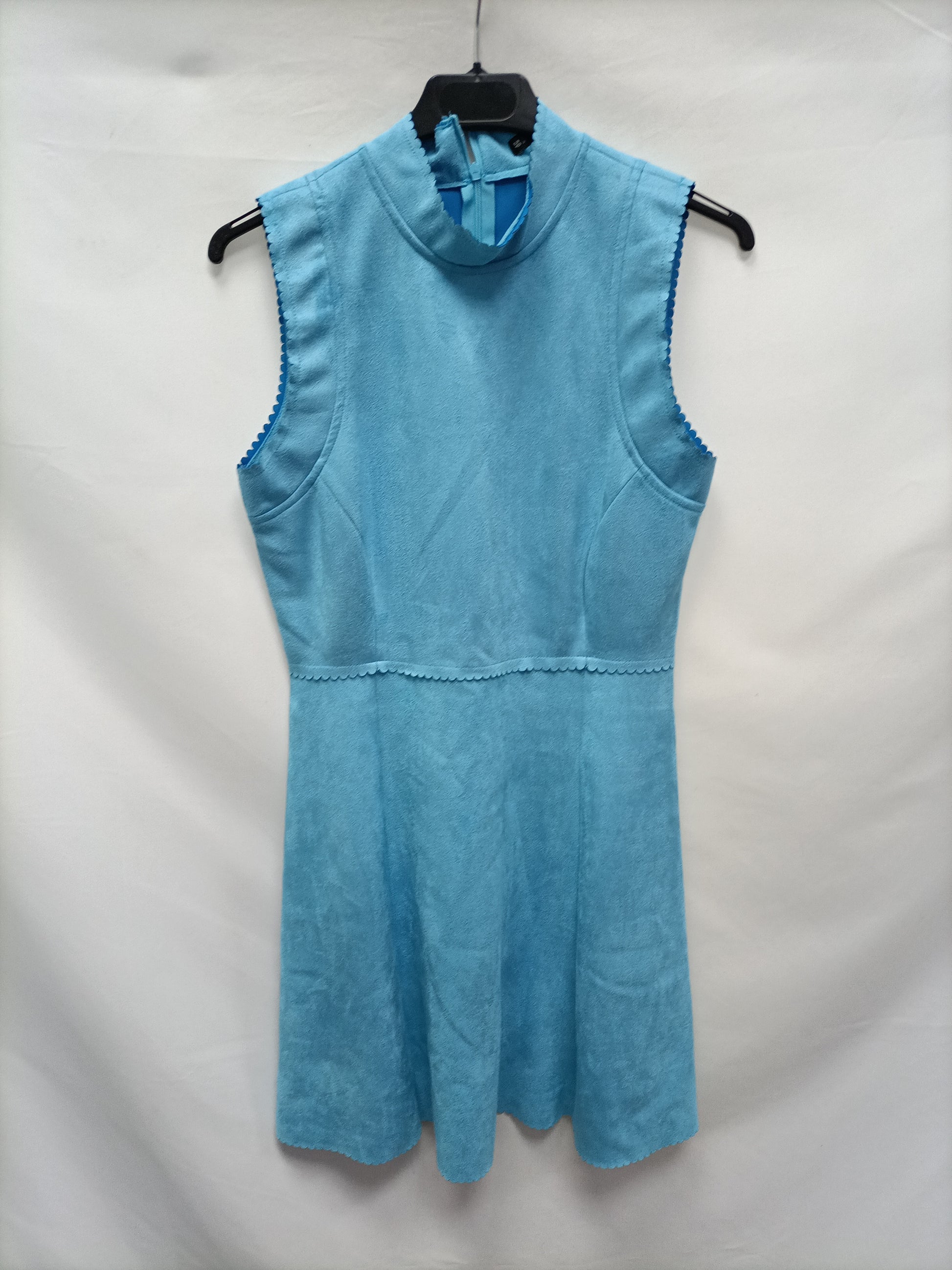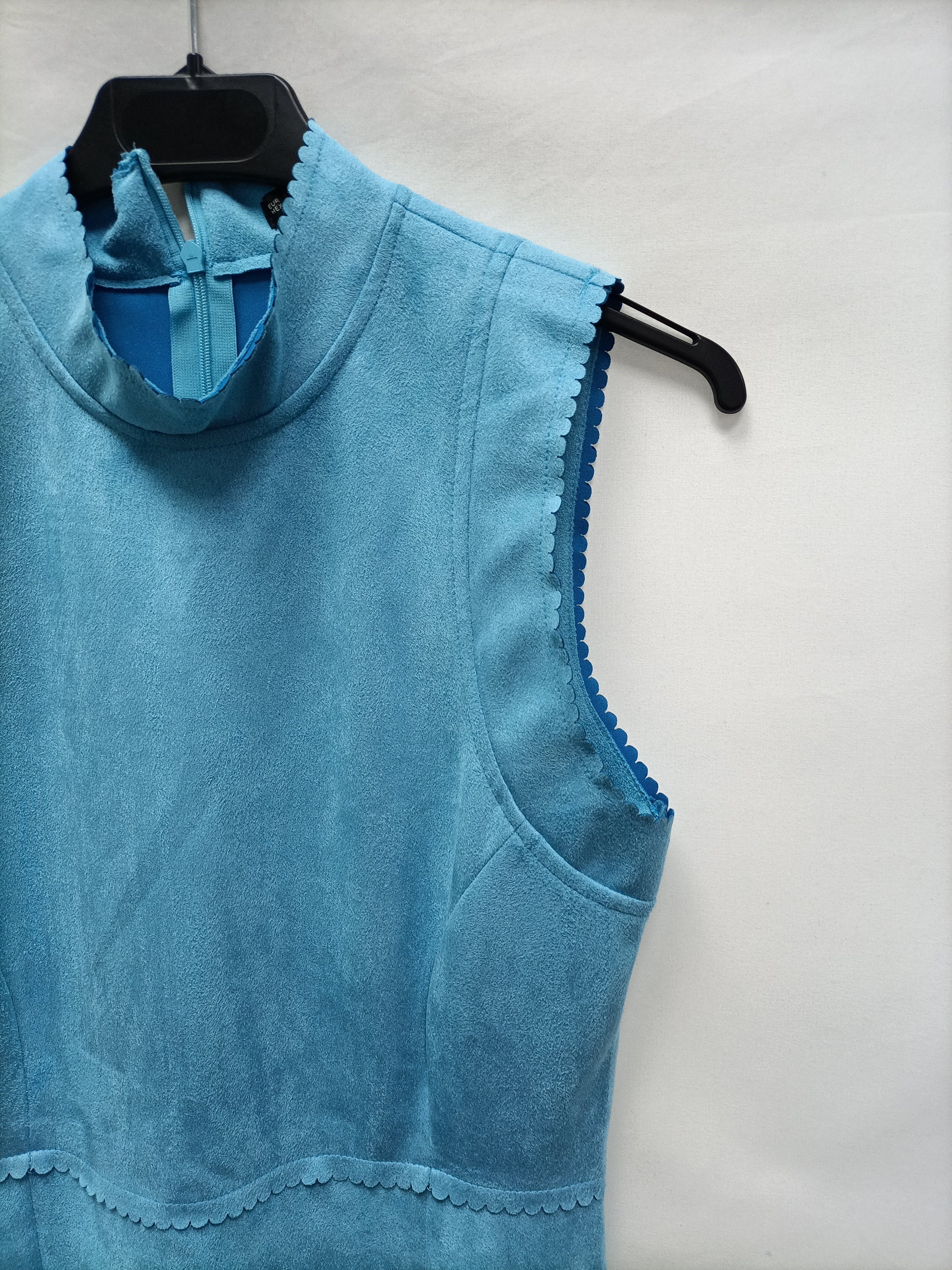 Vestido turquesa de antelina con el cuello perkins y detalles ondulados. Elastico. De sisa a sisa 41 cm Largo 87 cm