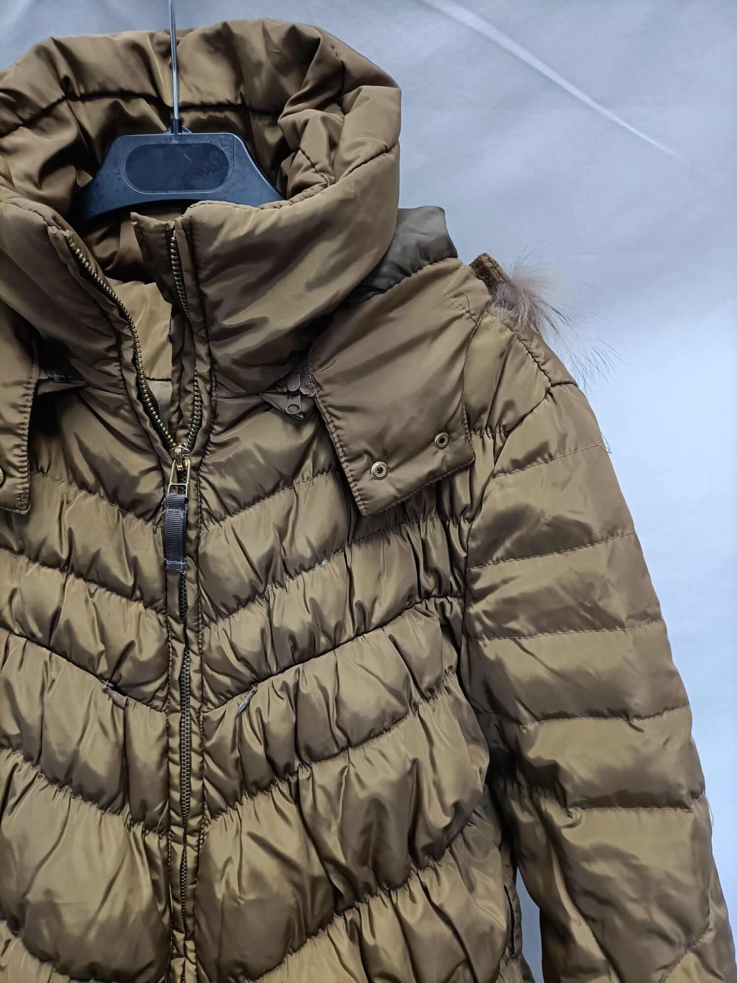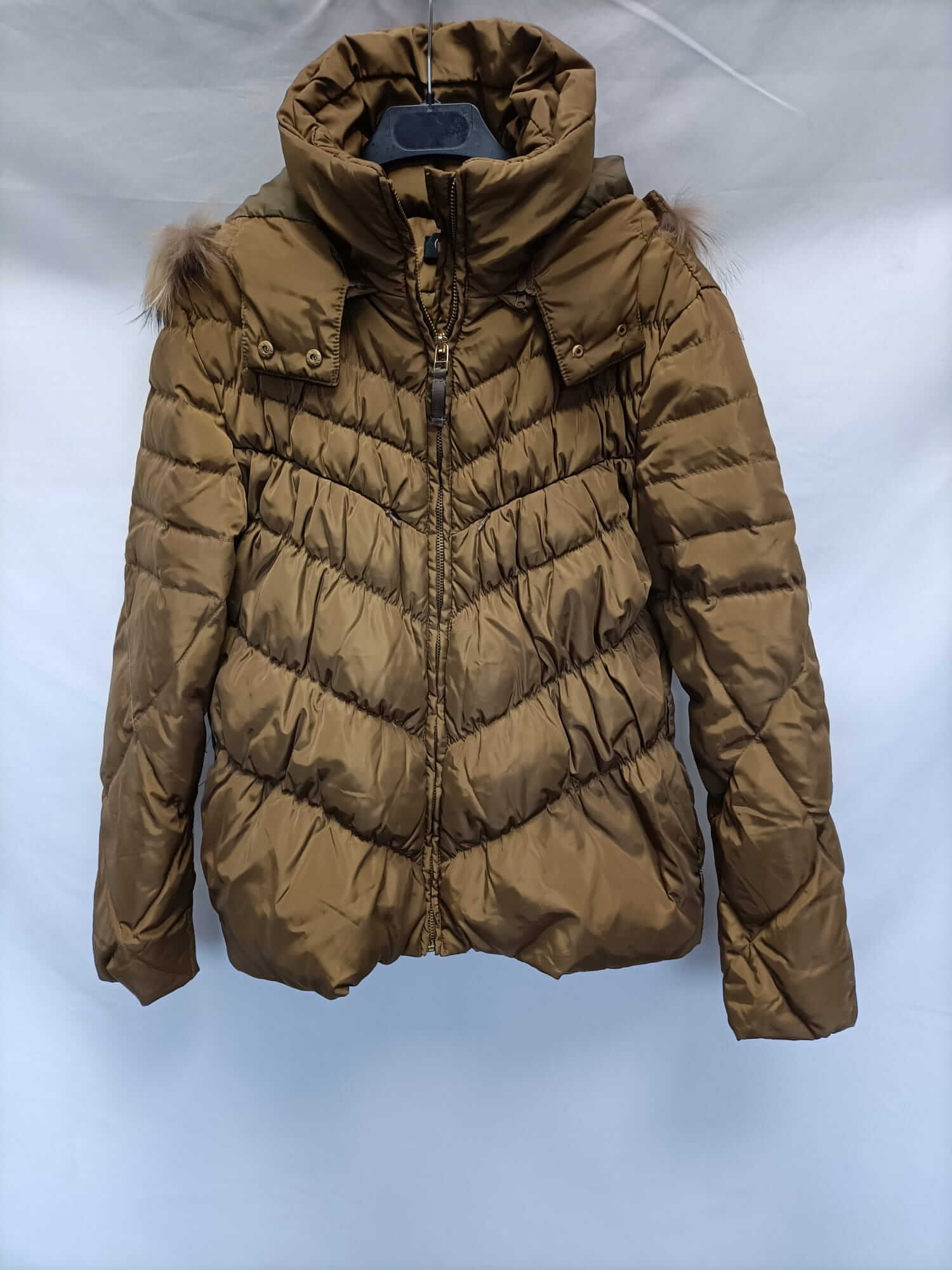 Sfera. M. Plumas verde con capucha extraíble de pelito y cuello alto. No elástico. De sisa a sisa 51 cm largo 66 cm