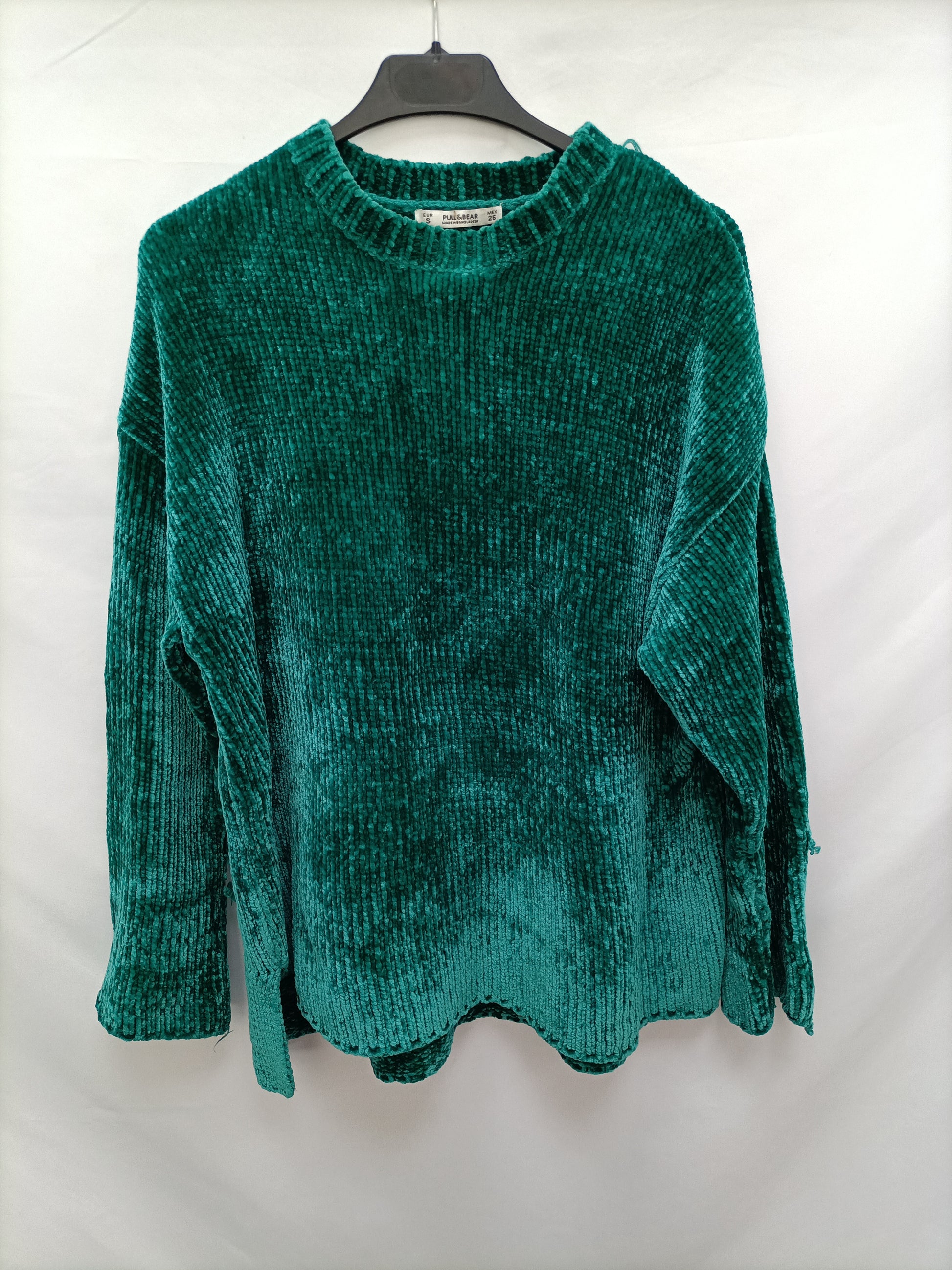 Jersey verde fluido de tejido estilo terciopelo gordito. Elastico. Largo 67 cm