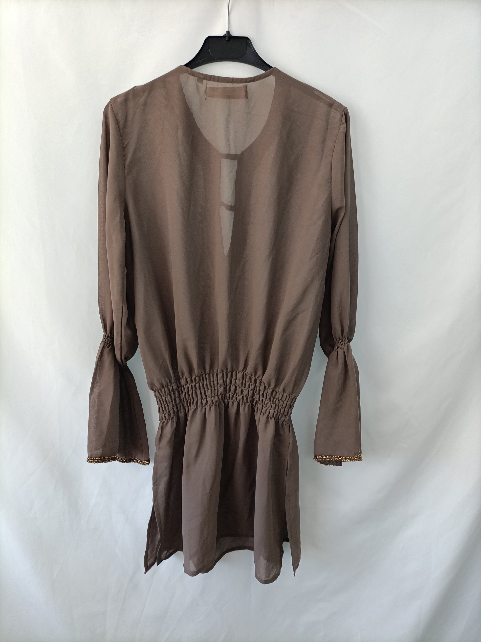 Blusa larga marrón semientransparente con abalorios en el cuello. Cintura elástica con aperturas. De sisa a sisa 53 cm Largo 86 cm