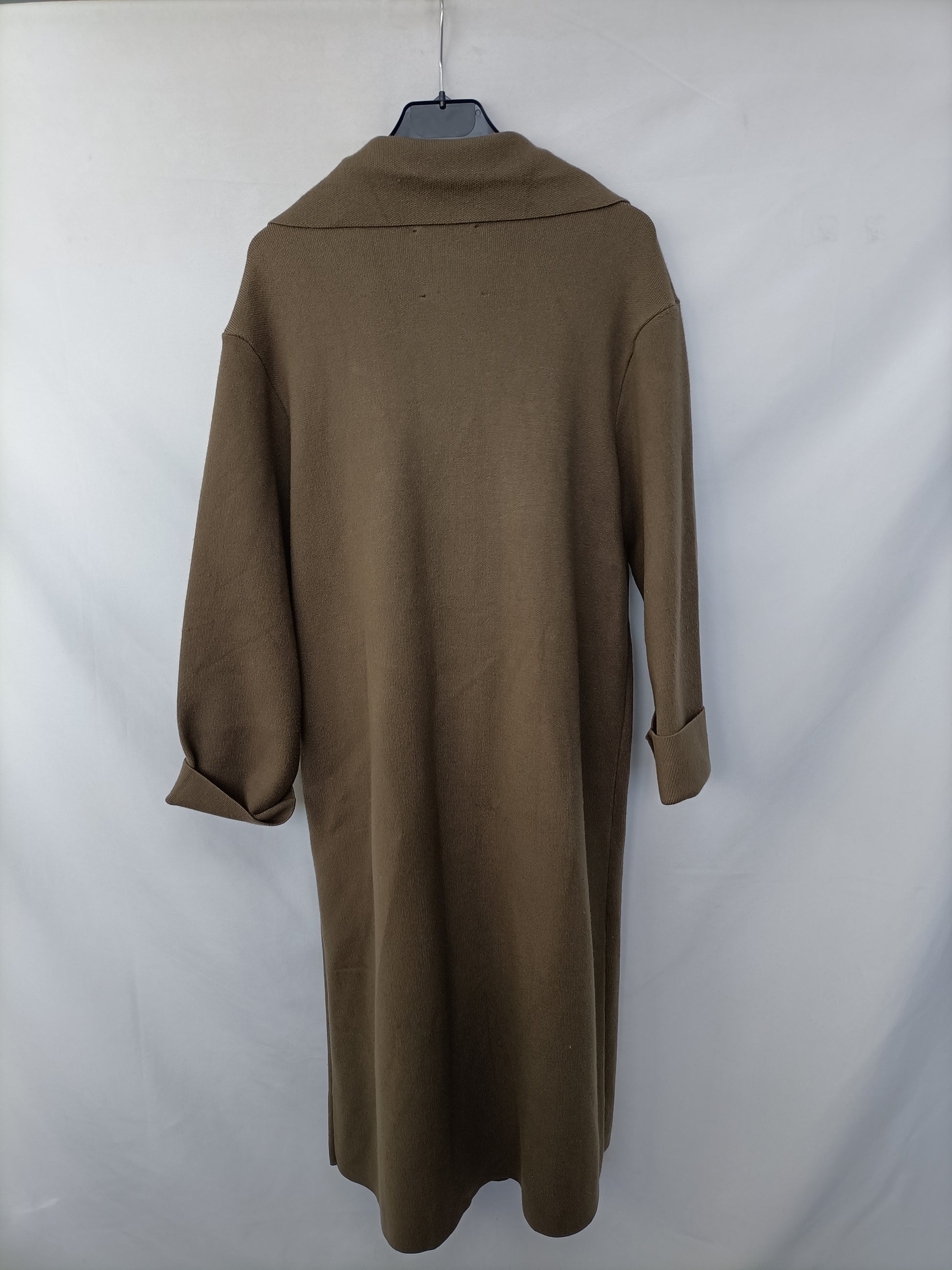 Cárdigan largo de punto verde caqui cruzado con cinturón. Elastico. largo 116 cm
