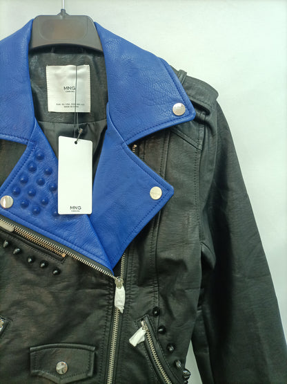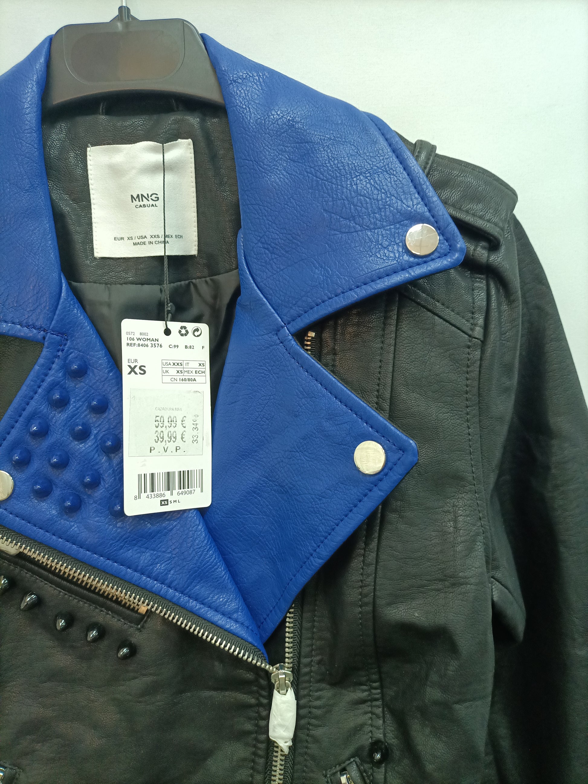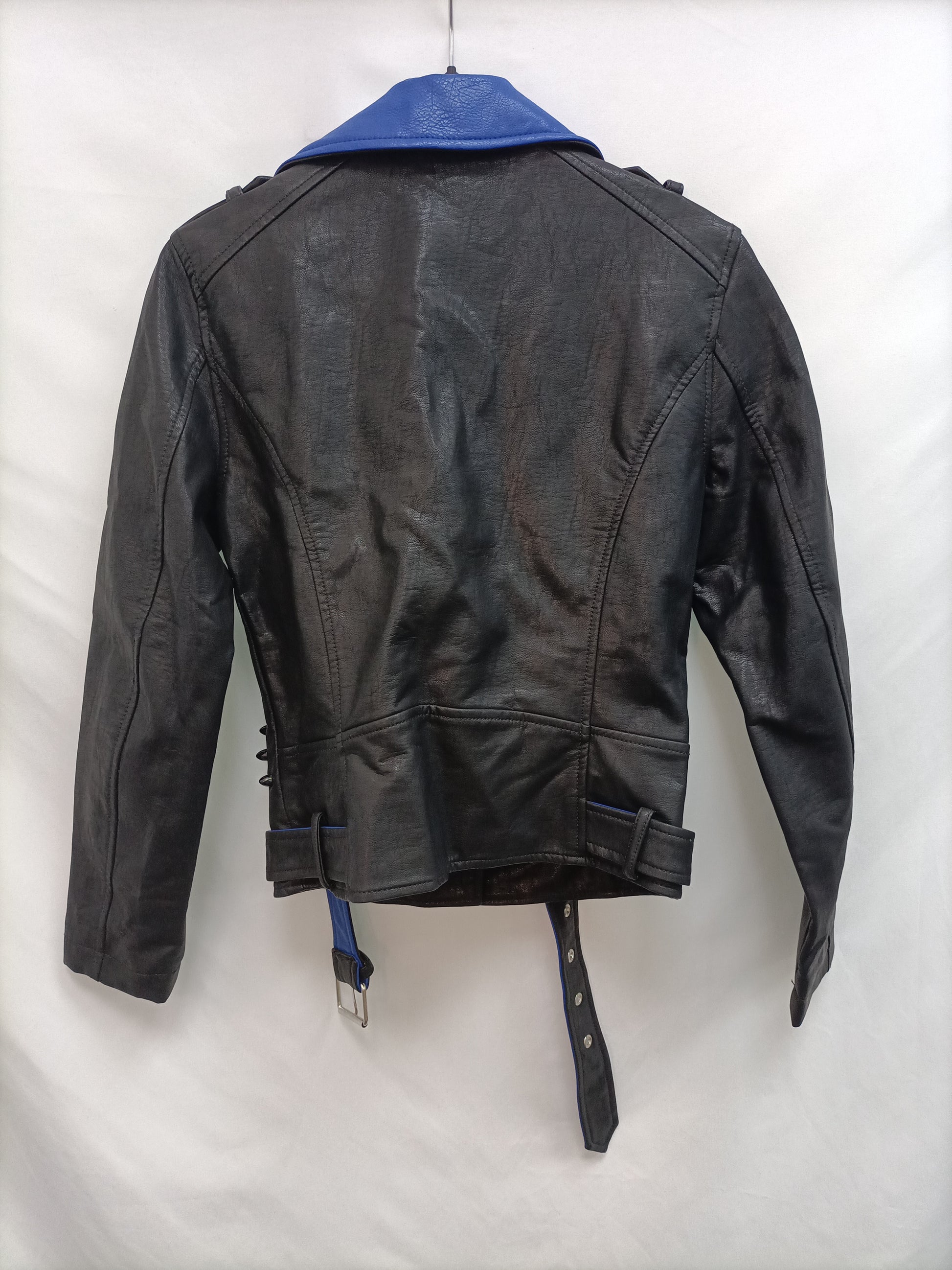 NUEVO CON ETIQUETA. Biker negra polipiel con la solapa azul. De sisa a sisa  41 Largo 57 cm