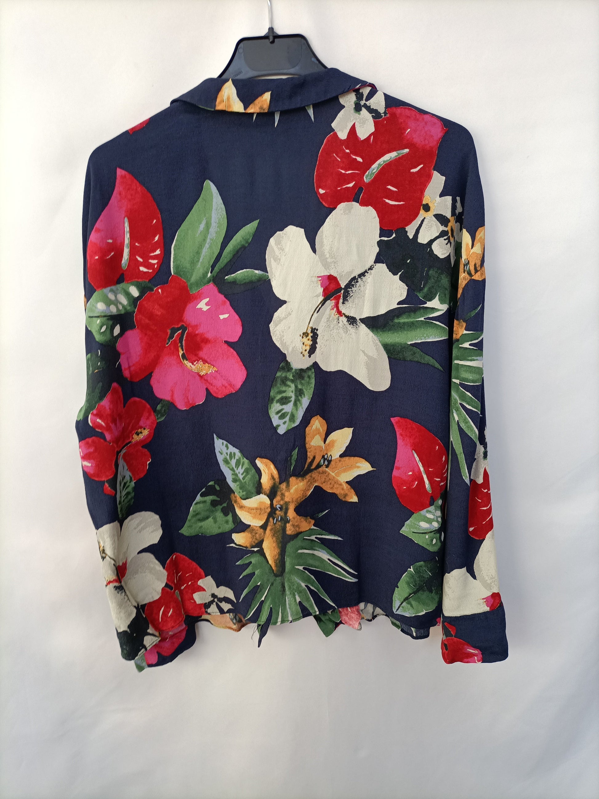 Blusa azul fluida con flores hawaianas. Abotnado. No elástica. De sisa a sisa 54 cm Largo 60 cm