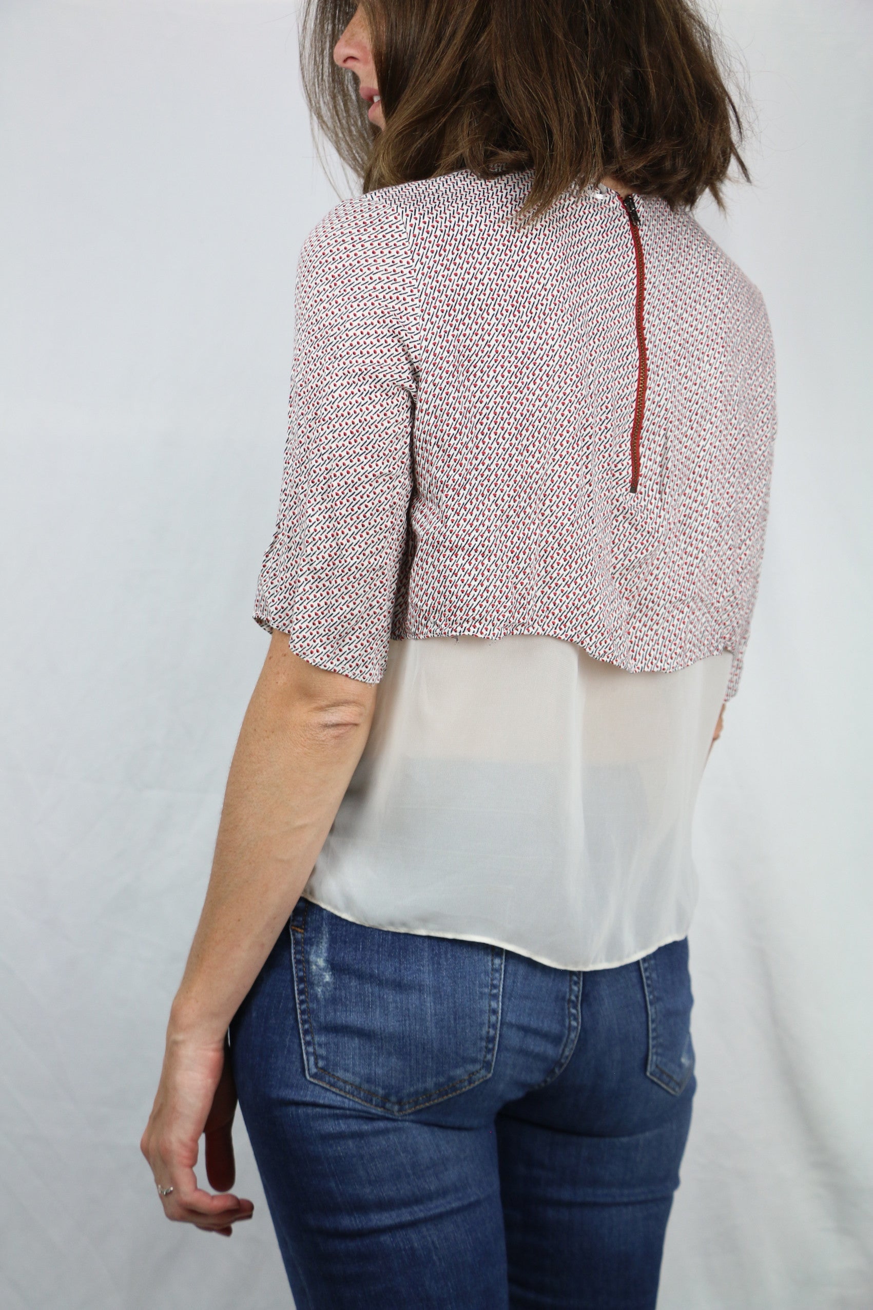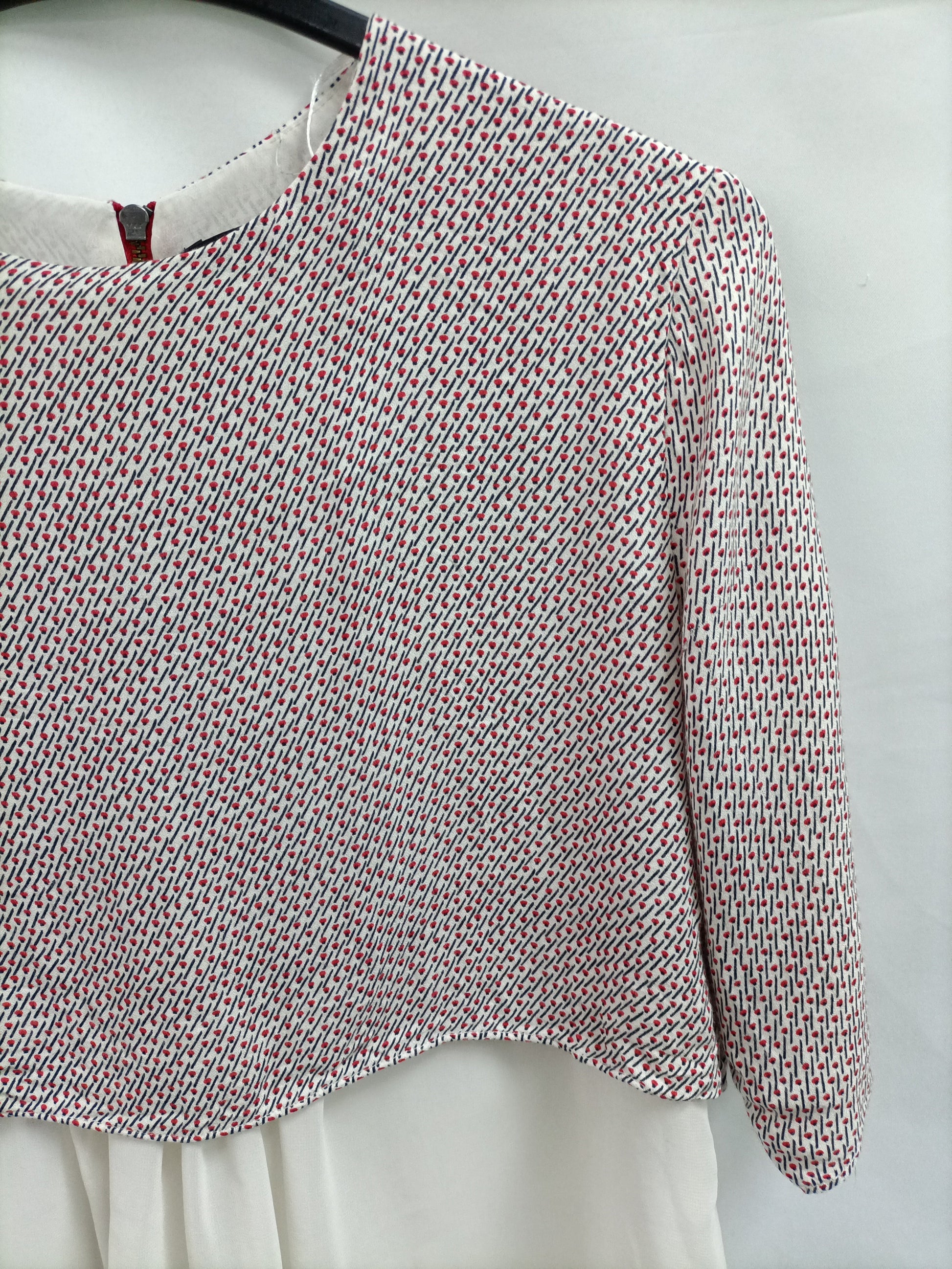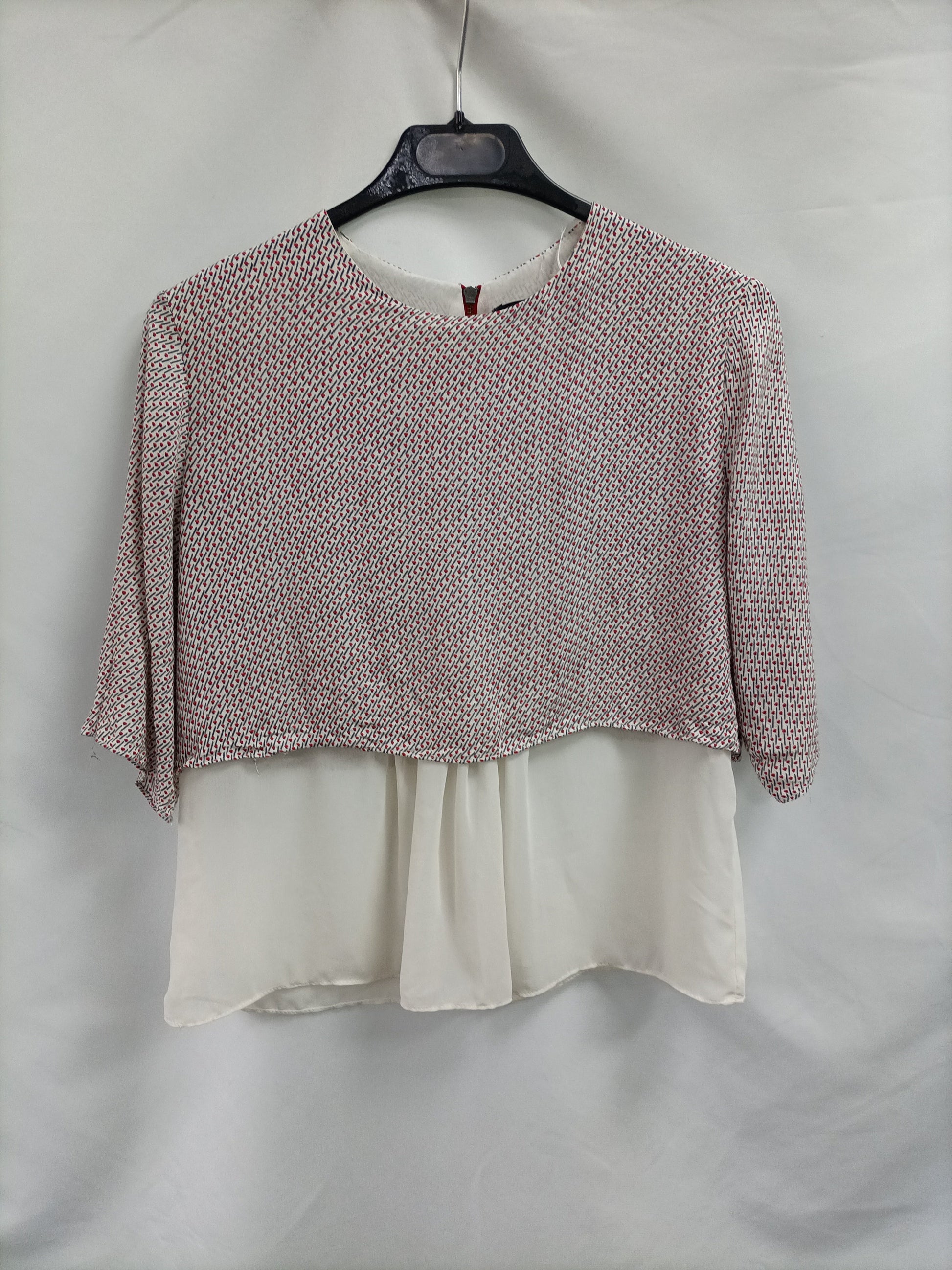 Blusa con tejido de dos texturas, parte de arriba con florecitas rojas y negras y parte de abajo de seda blanca. De sisa a sisa 49 cm largo 53 cm