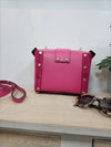 Bolso rosa fucsia rígido con asa corta dorada y asalarga extraíble. Antelina y polipiel. 22x16x10 cm