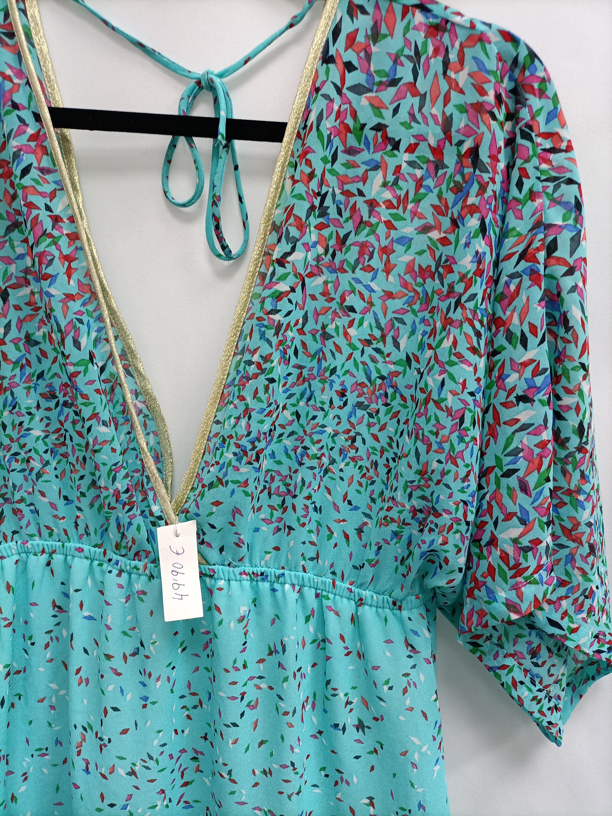 NUEVO CON ETIQUETA. Vestido largo tobillero turquesa con detalle de formas geométricas en colores. Escote y espalds en pico. Largo 132 cm