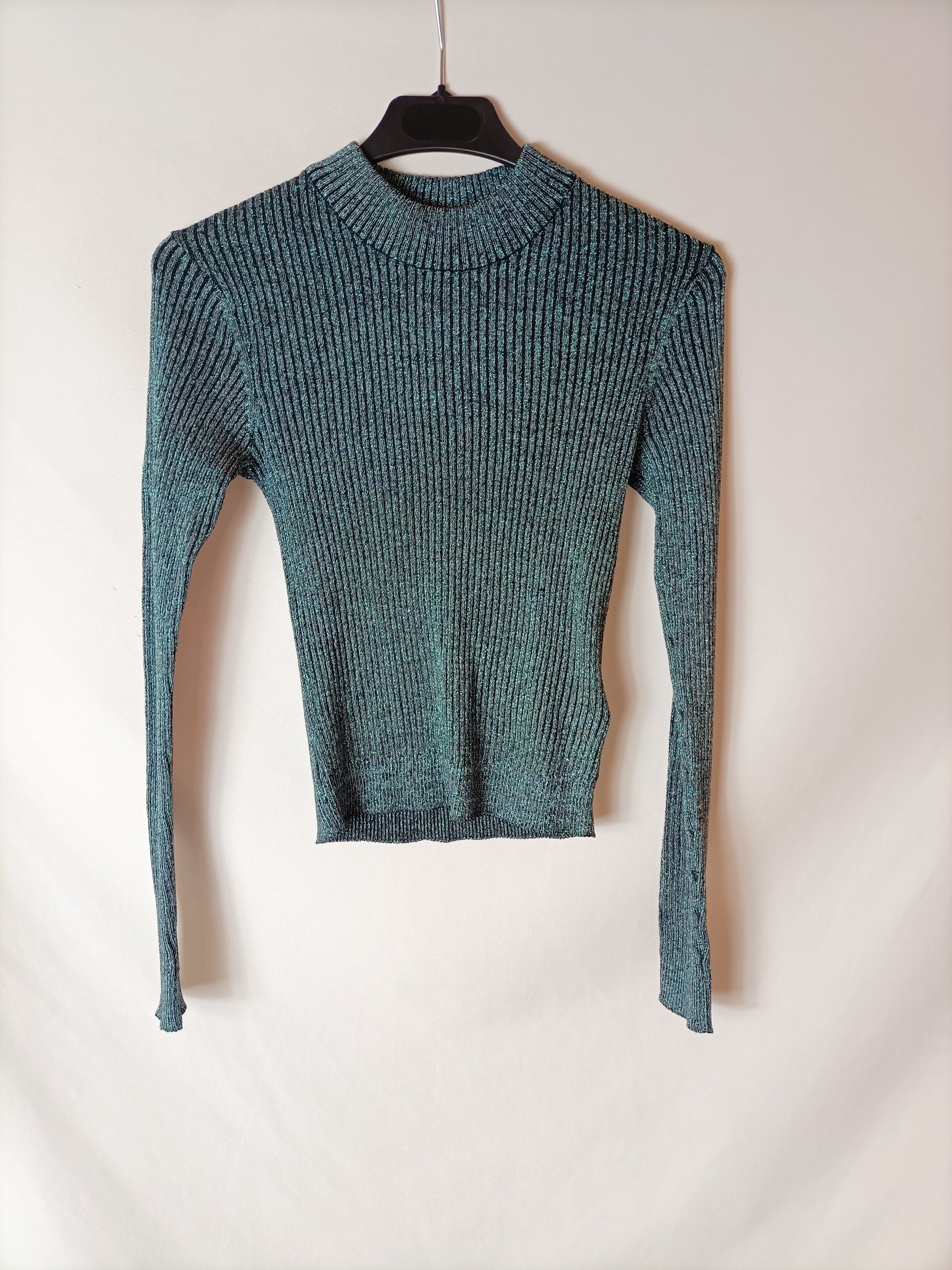 Top hilos plateados, azules y negros brillantes. Tejido elástico.