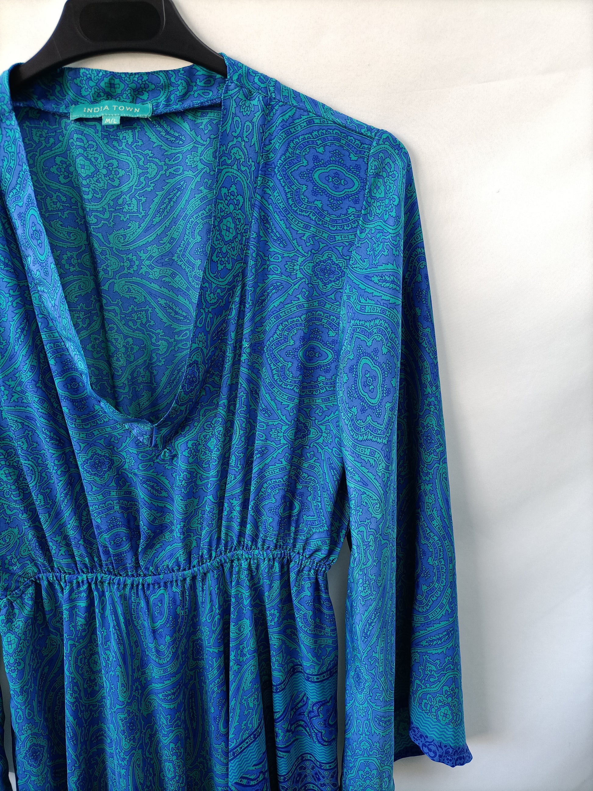 Vestido largo azul y verde estilo hippie fluido. Cintura elástica. No elástica. De sisa a sisa 45 cm Largo 144 cm