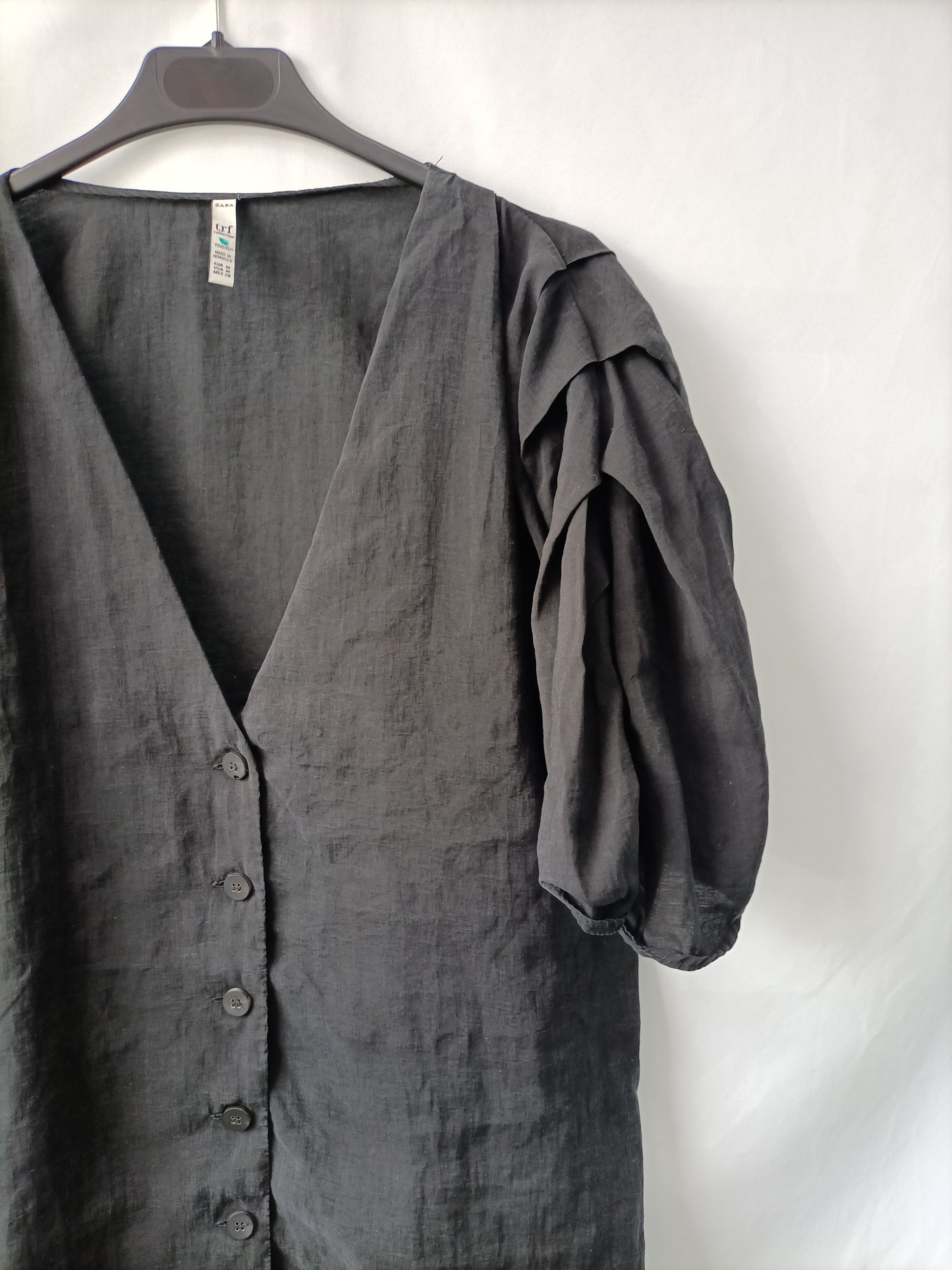 Vestido corto negro con las mangas Abullonadas. De sisa a sisa 52 cm largo 81 cm