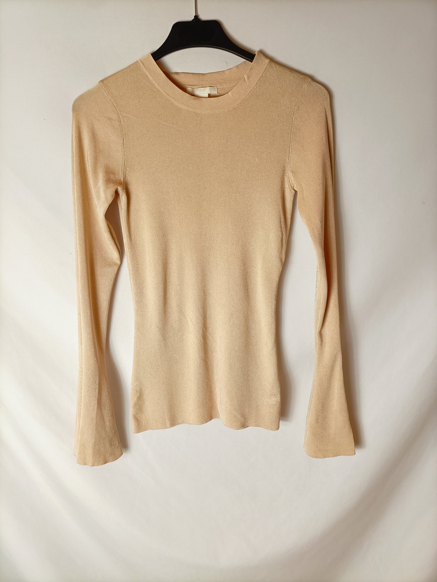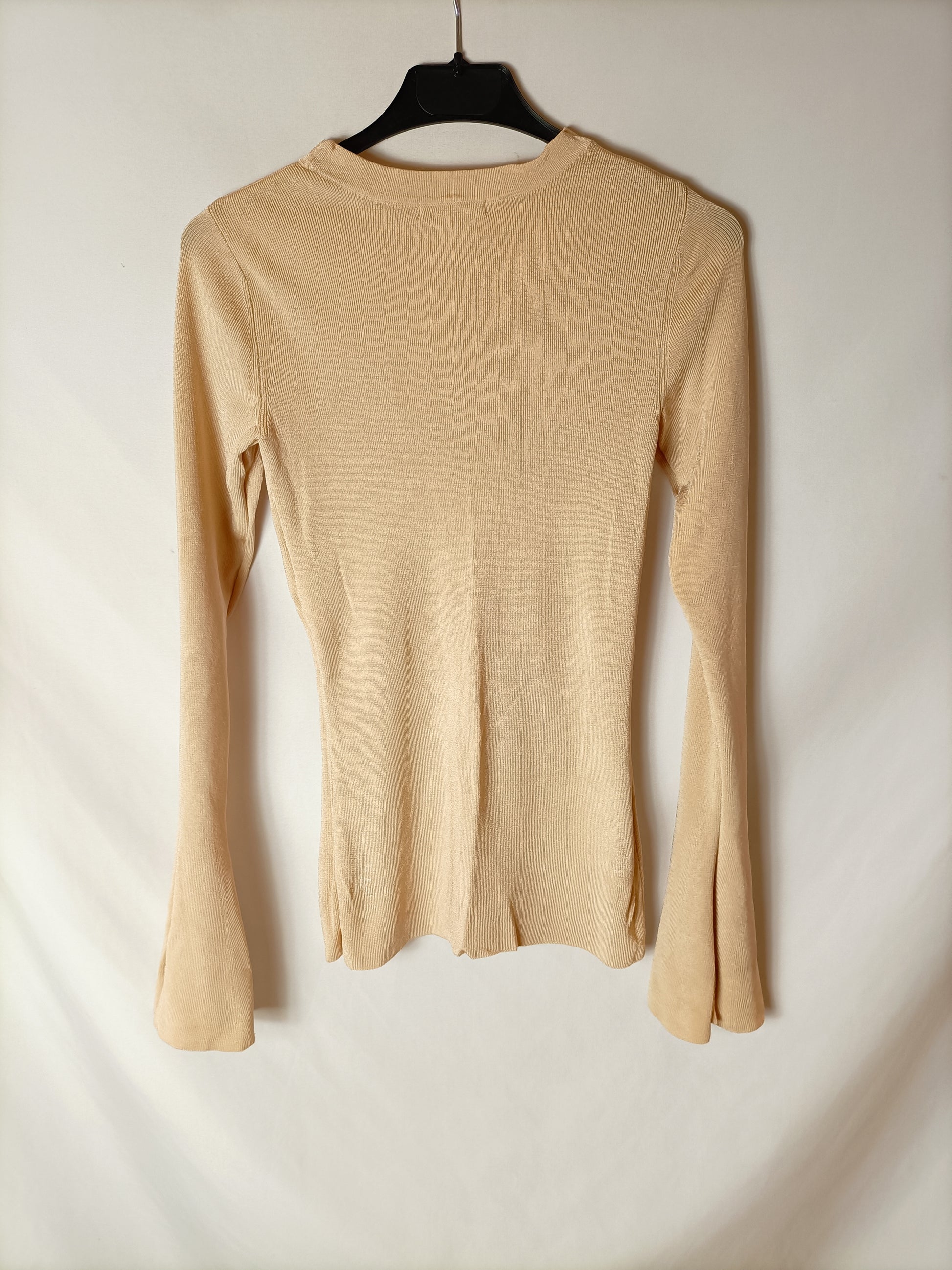 Top rosa con detalle de manga larga acampanada. Tejido elástico.