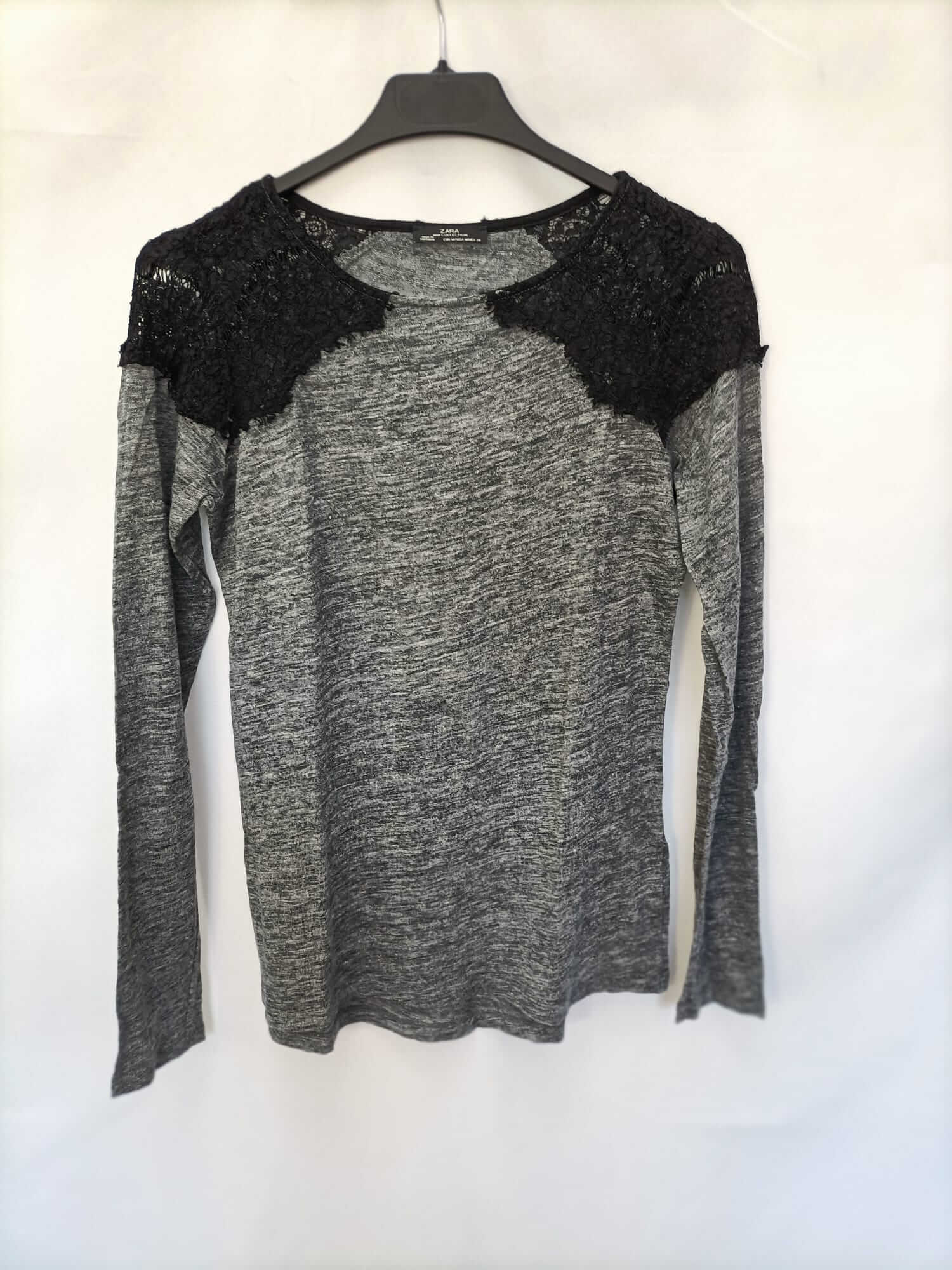 Zara. M. Camiseta gris jaspeada con detalle de encaje en los hombros. Elástica. De sisa a sisa 44 cm largo 60 cm