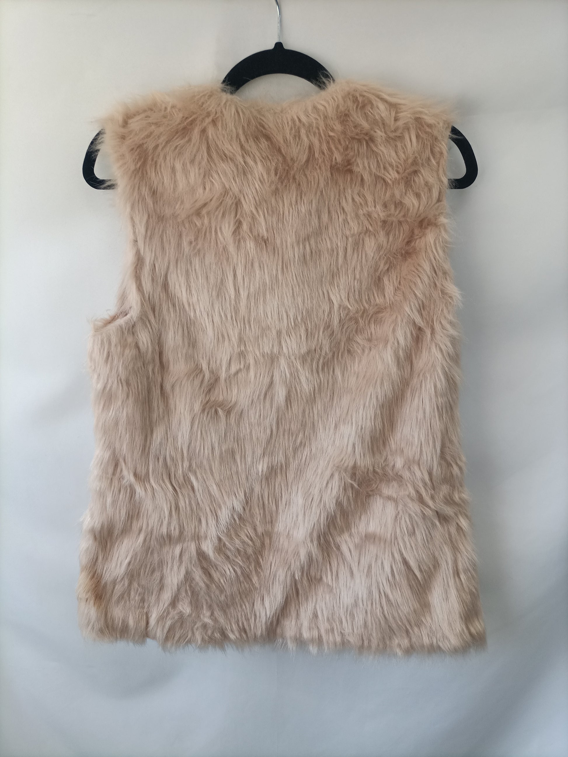 Chaleco de pelo sintético beige. Se abrocha con corchetes. No elástico. De sisa a sisa 49 cm largo 63 cm