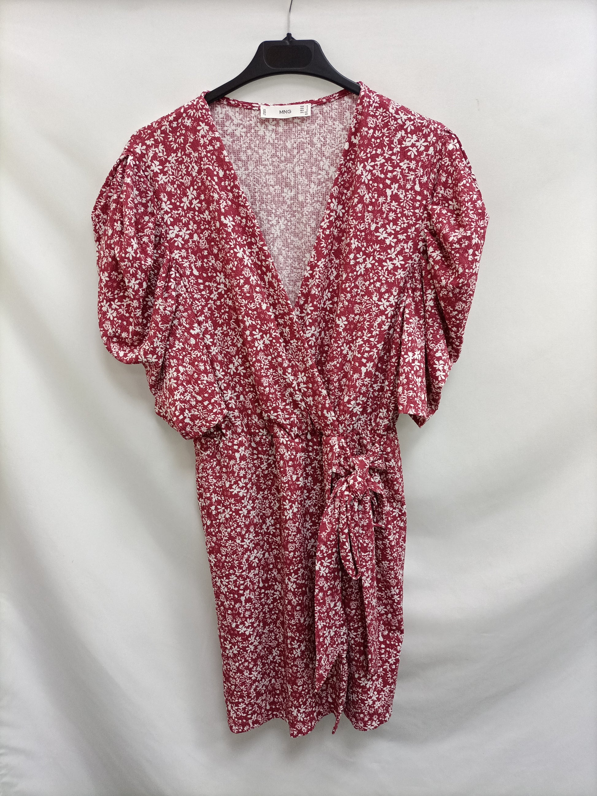 Vestido burdeos de flores con las mangas Abullonadas y escote cruzado. Elastico. largo 85 cm