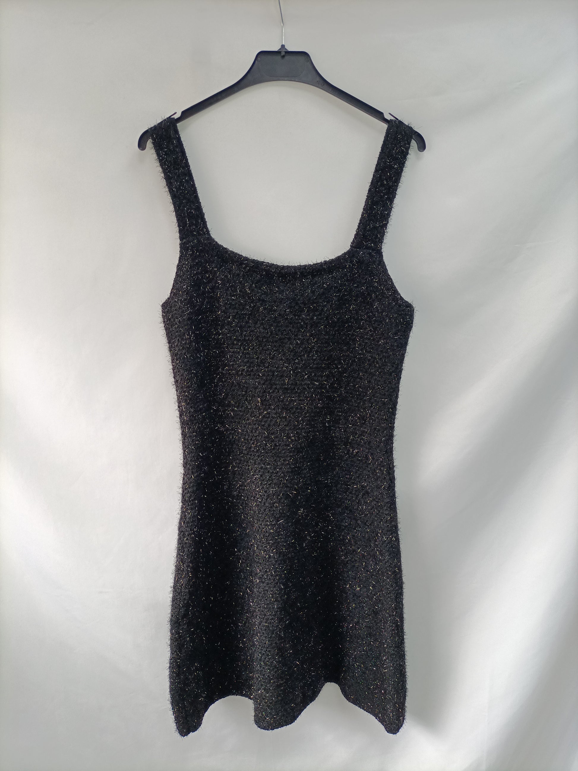 NUEVO CON ETIQUETA.Vestido negro de punto con pelito Elastico hilo metálico . Largo 98 cm
