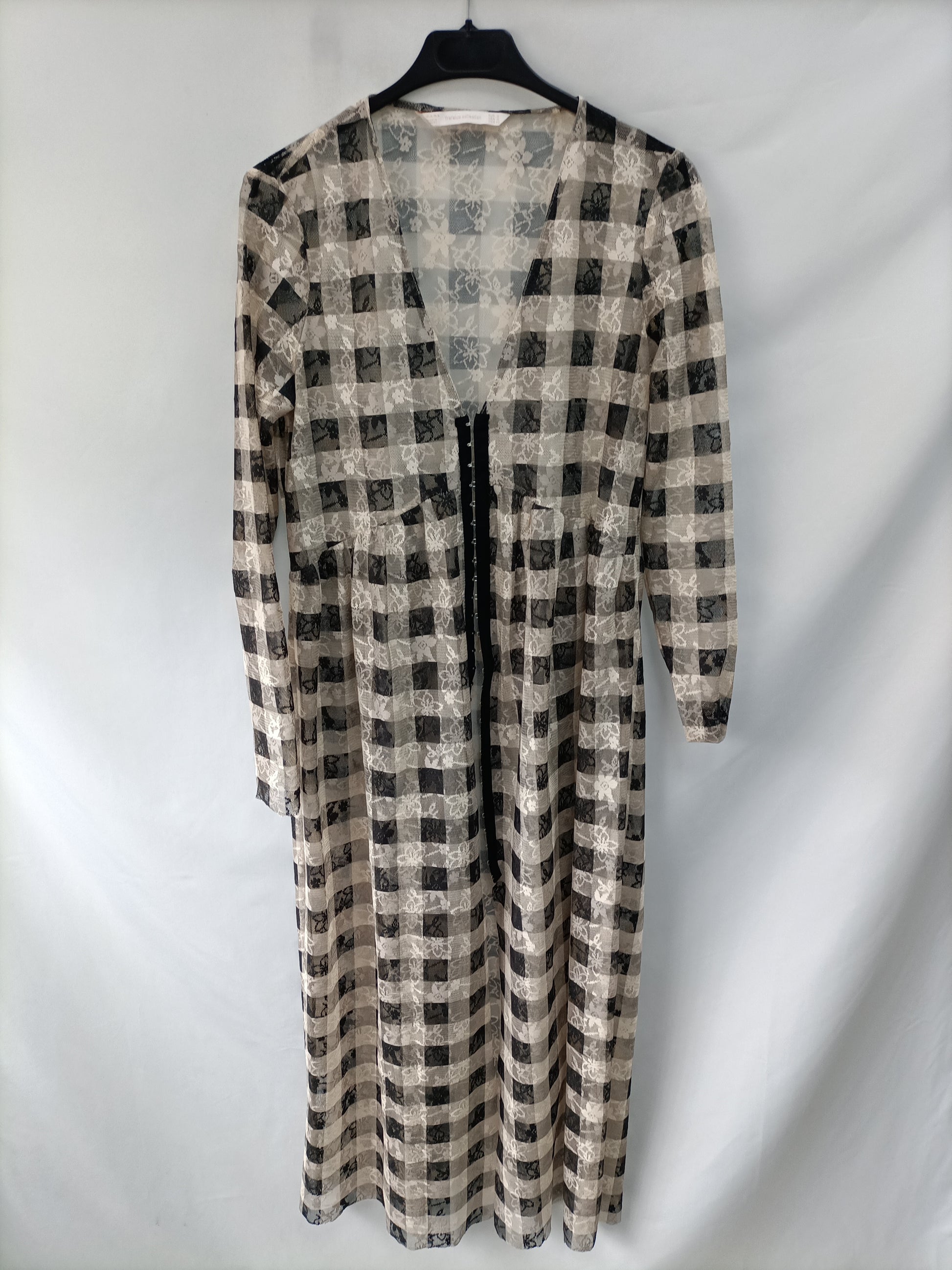 Vestido de encaje beige y negro de cuando fluido y semitranparente. Elastico cse abrocha con corchetes. largo 124 cm
