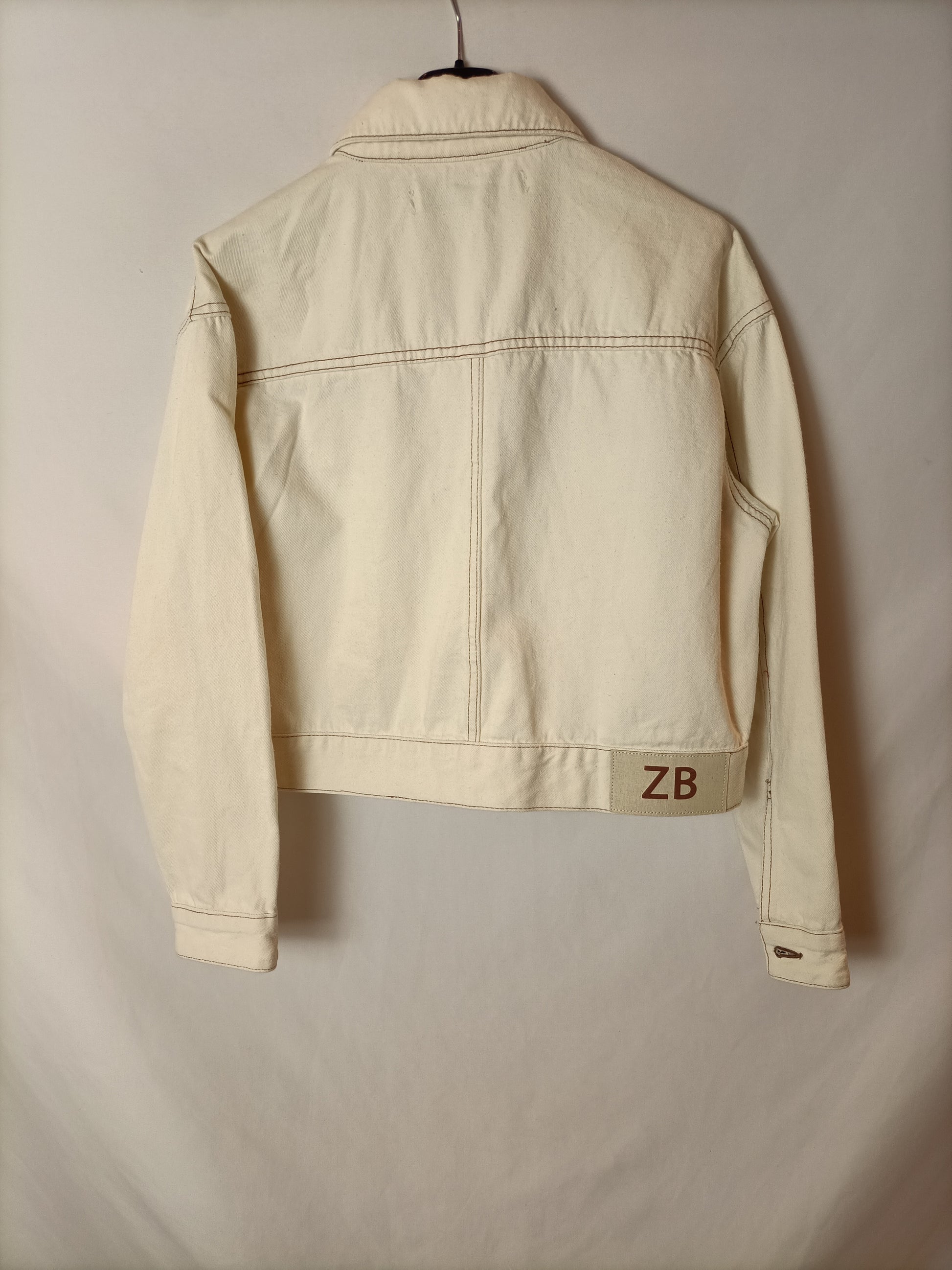 cazadora vaquera beige con costuras marrones. de sisa a sisa 49 cm largo 52 cm