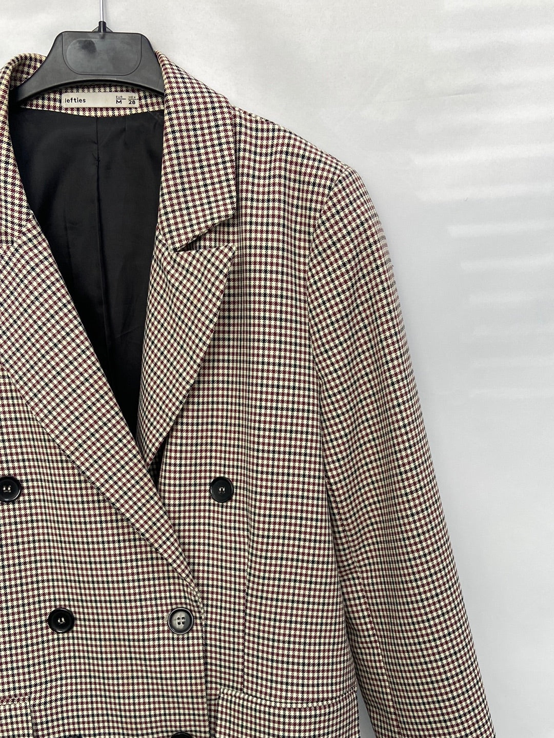 blazer cruzada pata de gallo. Tonos beiges, negros y burdeos. Largo 75 cm. Tara: tiene la zona del cuello un poco desgastada