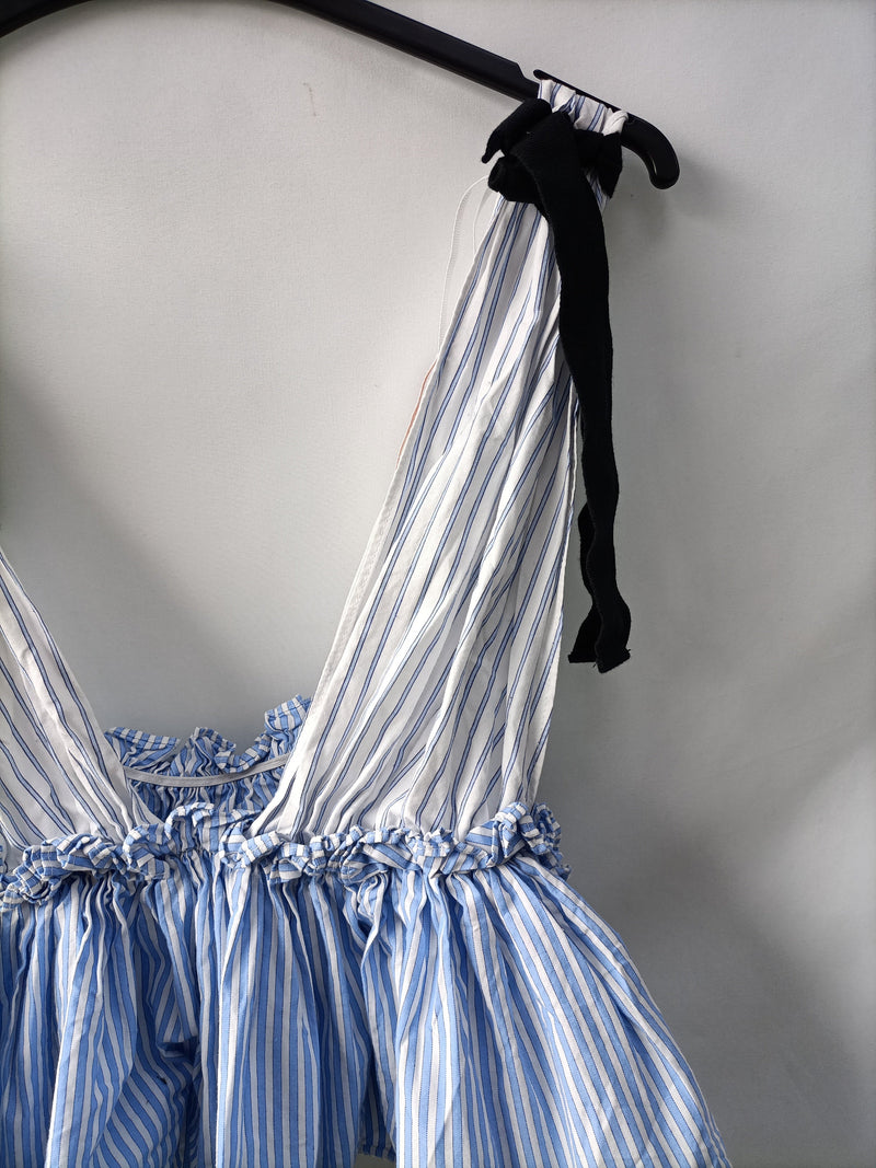 Croptop con escote pronunciado con volantes y con lazada en los hombros.