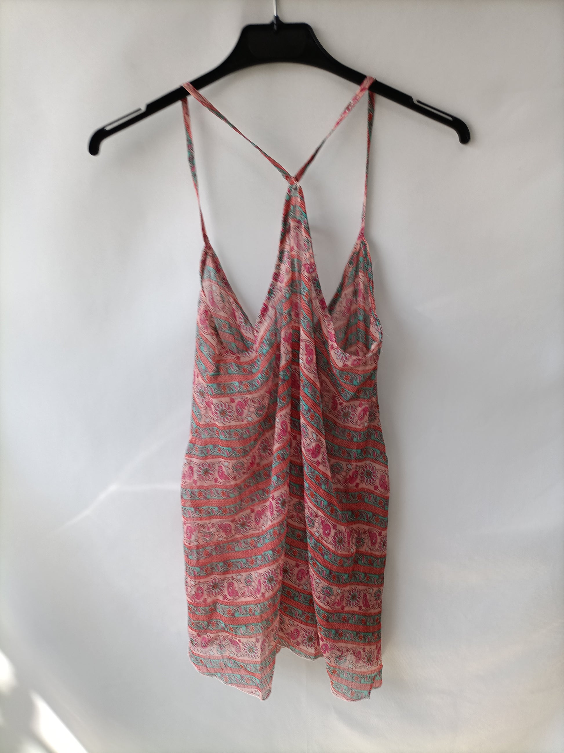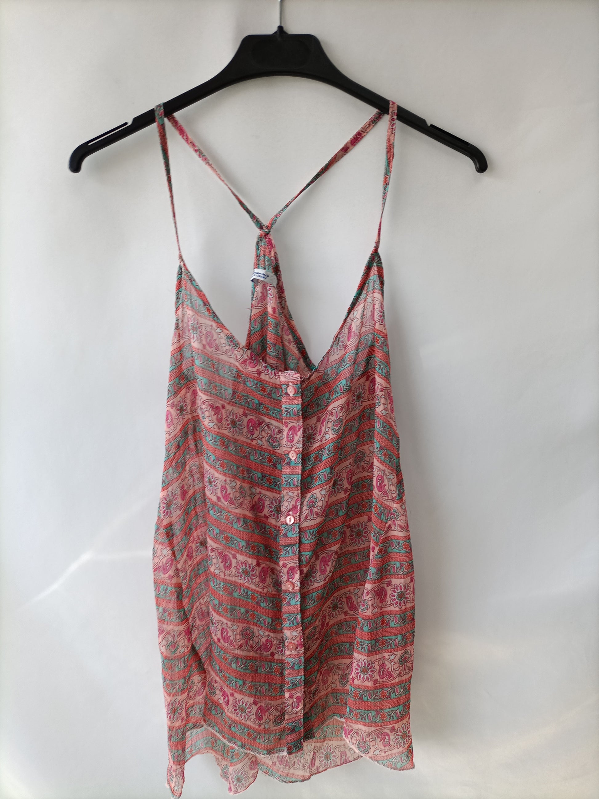 Top fluido con estampado de flores en tonos rosas. Abotonado por delante y semitranparente. No elástico. De sisa a sisa 46 cm largo 72 cm