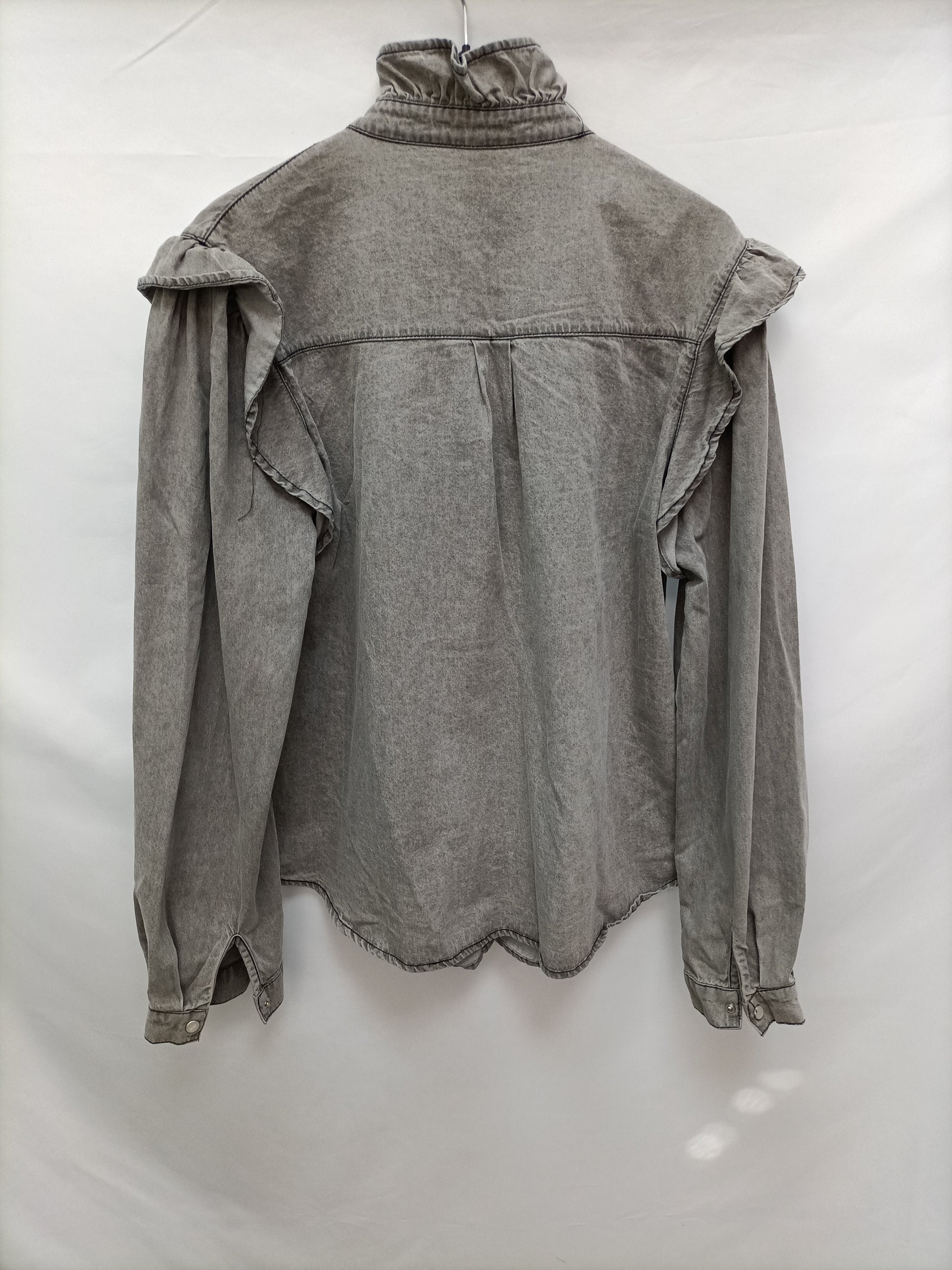 Camisa denim en tono gris co volantes. Se abrocha con botones de clip. no elastica. De sisa a sisa 55 cm Largo 70 cm