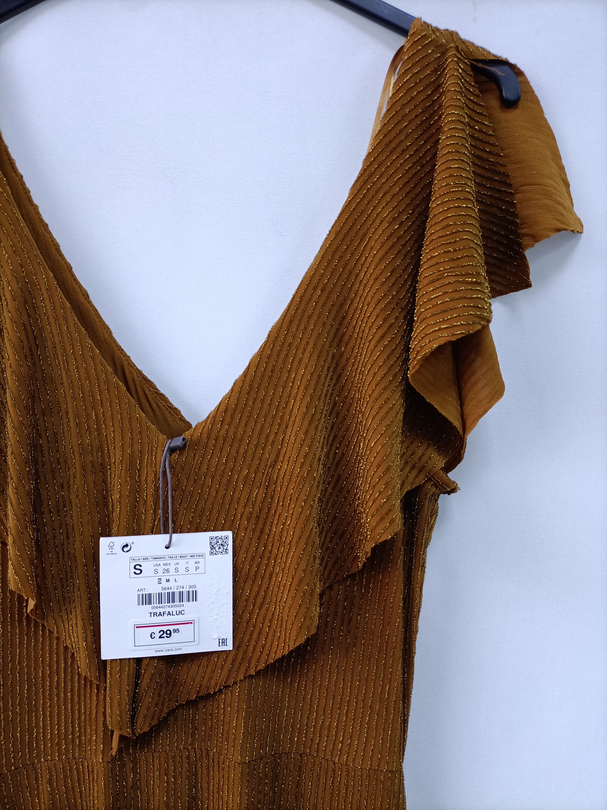NUEVO CON ETIQUETA. Vestido midi de punto Mostaza hilos dorados. largo 128 cm