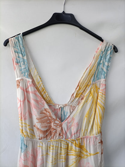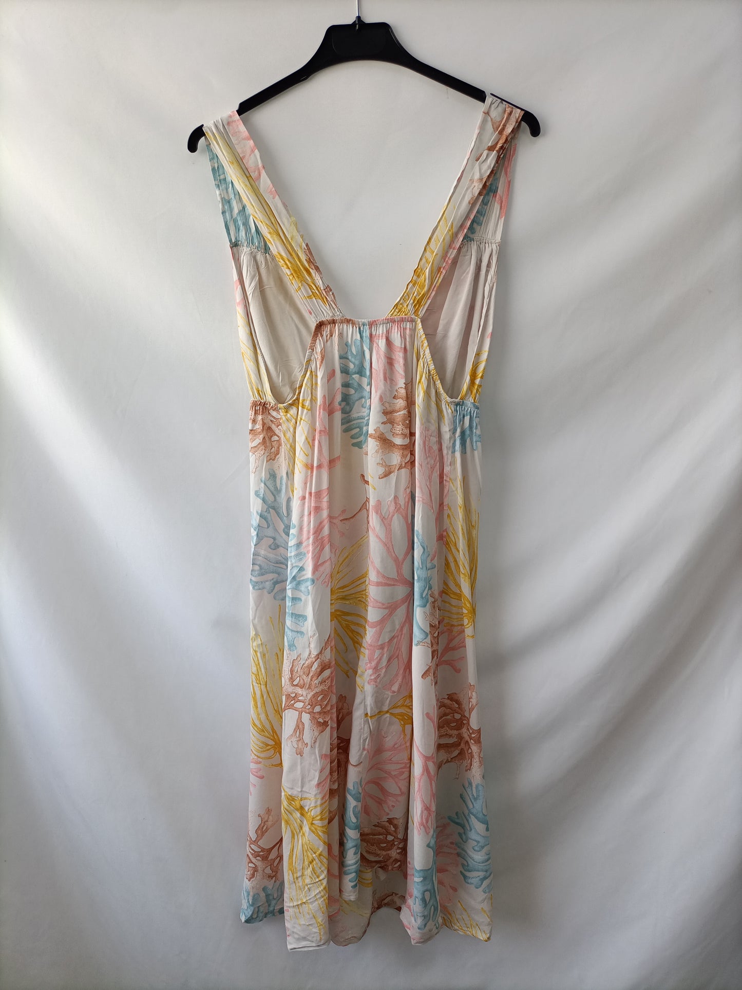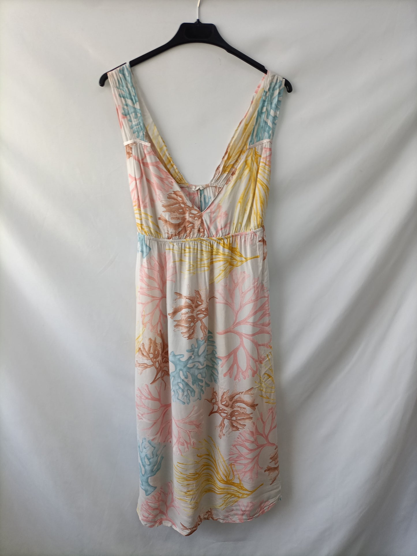 Vestido corto grisaceo con estampado de corales. Largo 108 cm