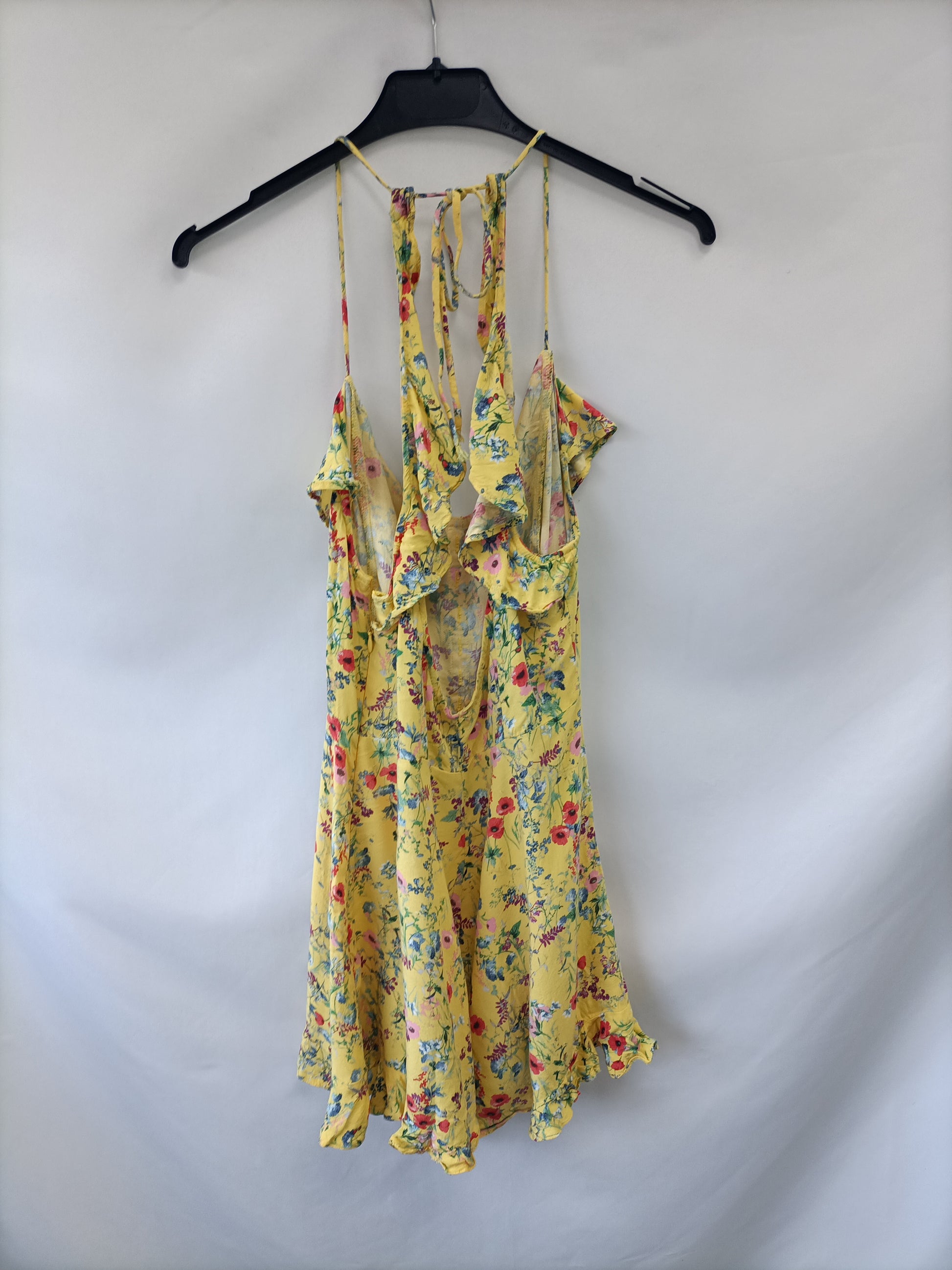 Mono corto amarillo con flores. Espda abierta y tirantes regulables. Largo 79 cm