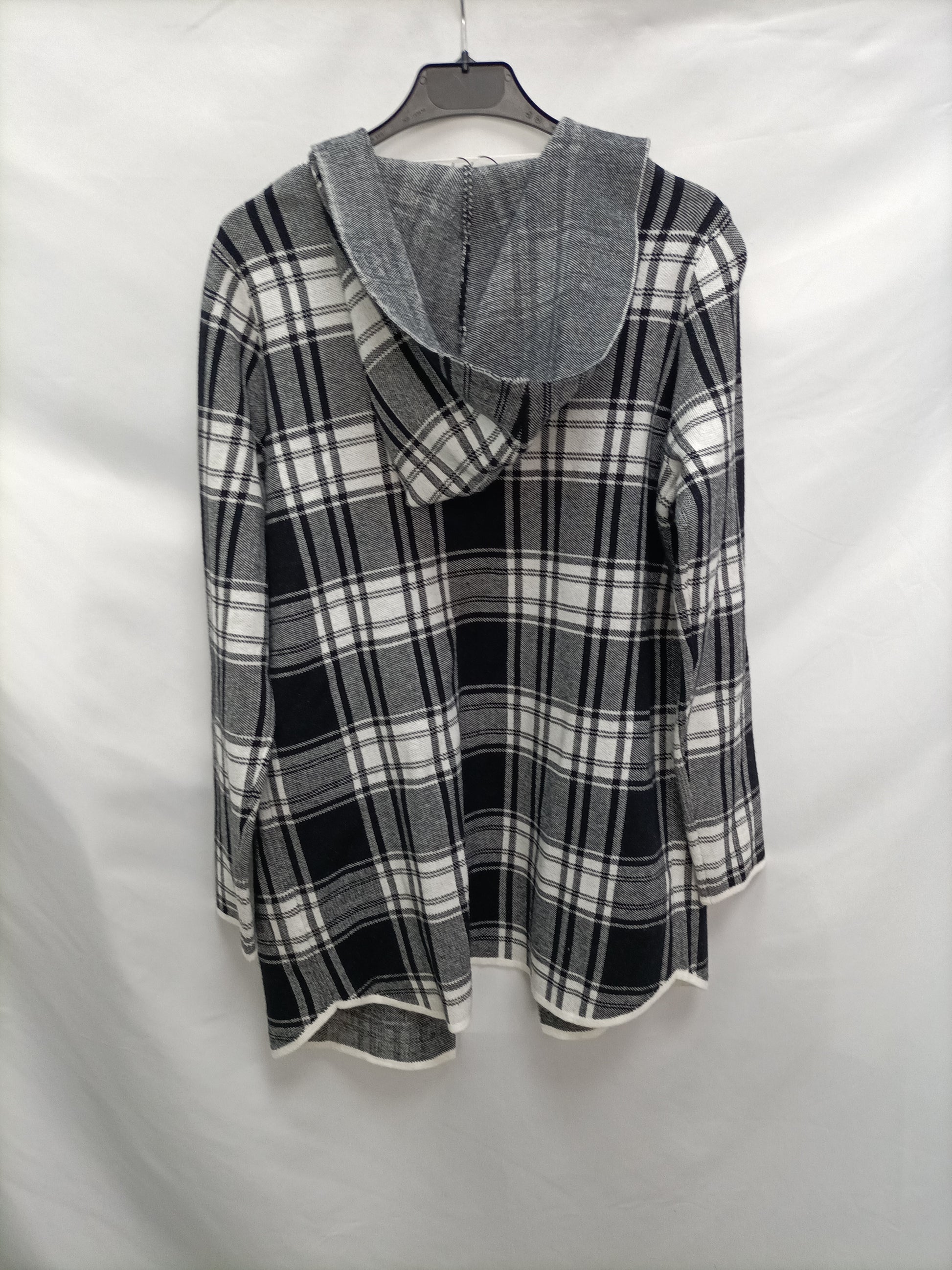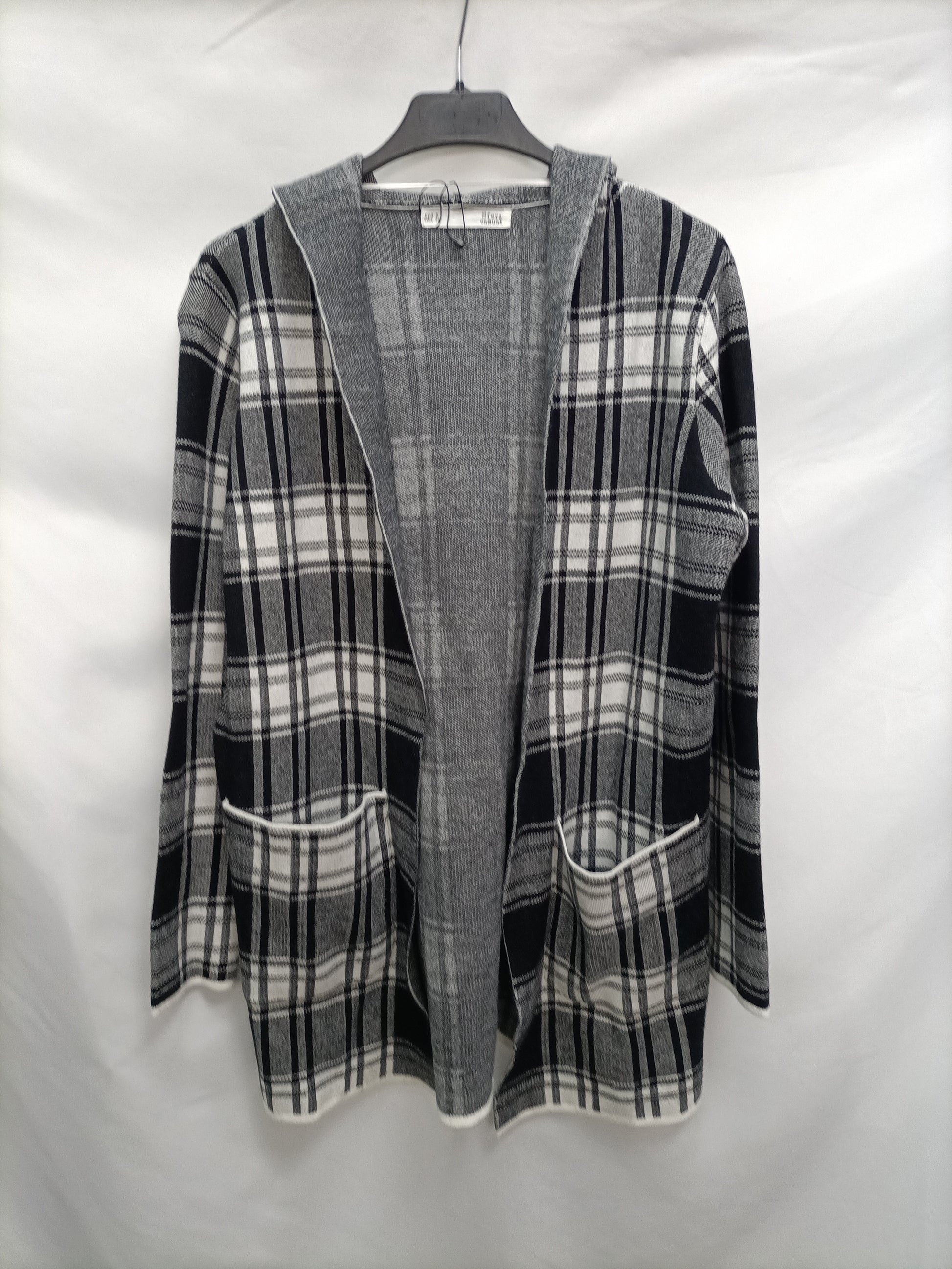 Cárdigan de cuadros blanco y negro con capucha. Elastica. largo 74 cm.
