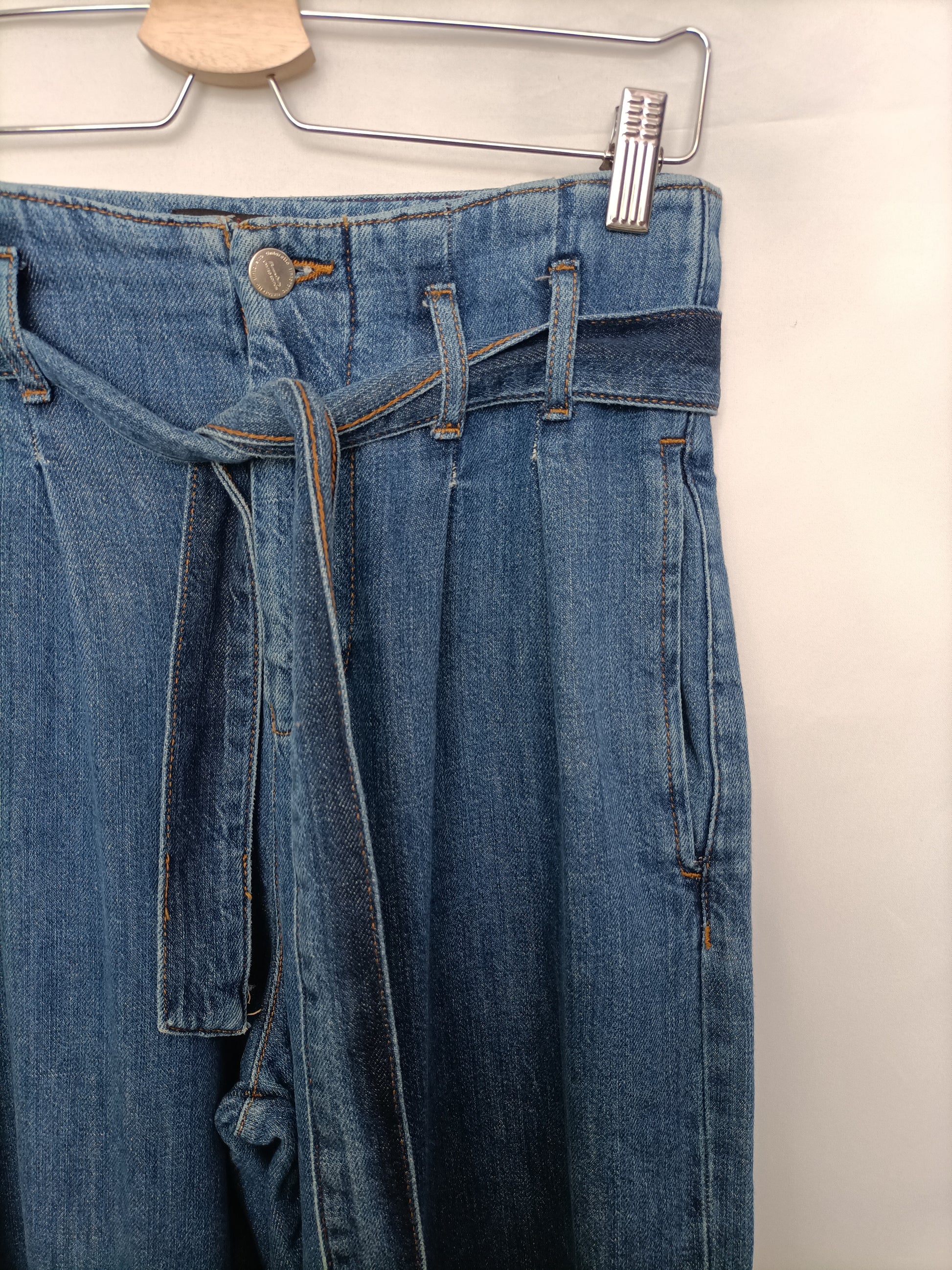 Pantalón ancho fluidez de tejido denim finito. Detalle de cinturón estilo lazada. No elastico. Cintura 40 cm  Largo 109 cm
