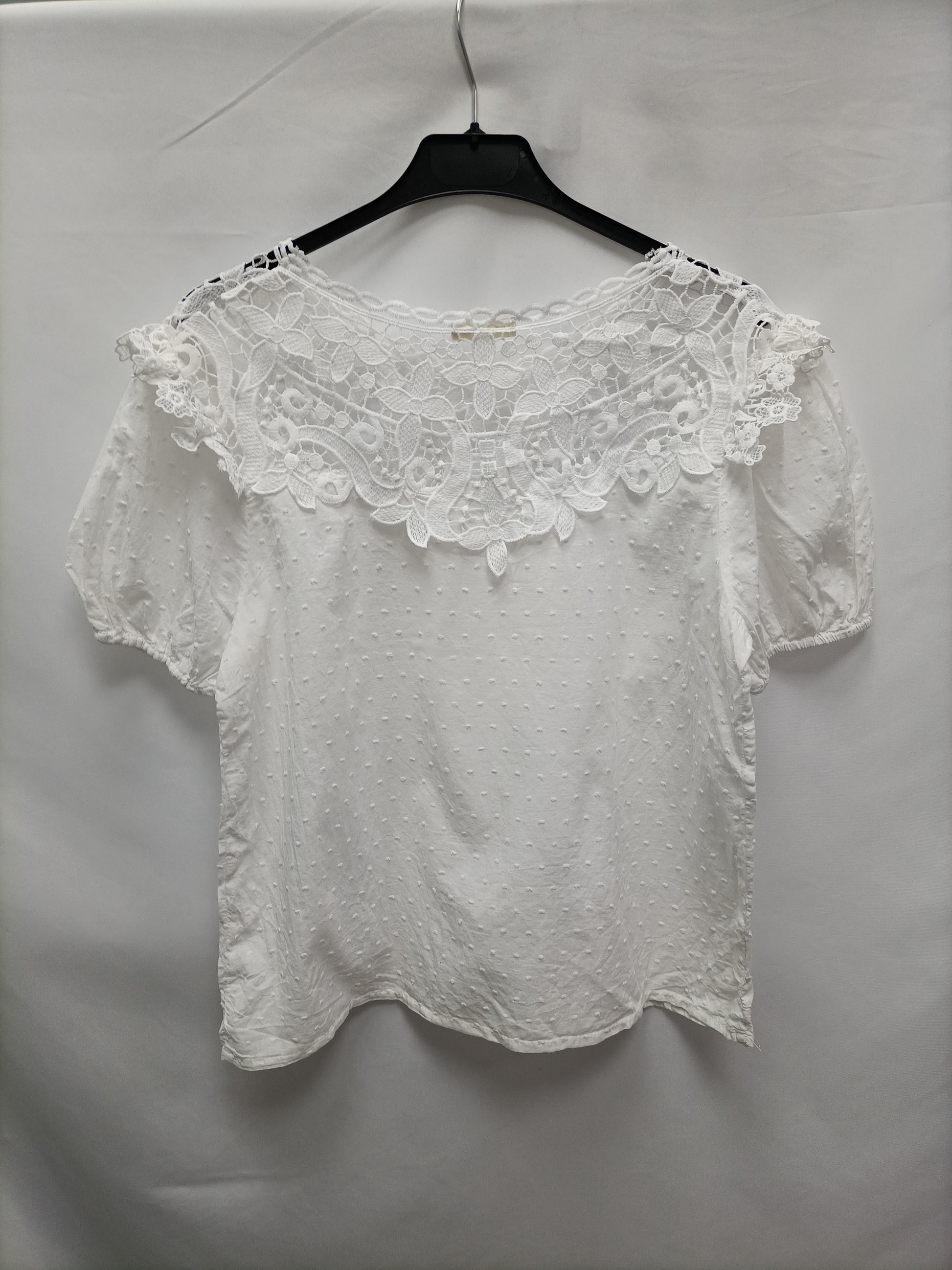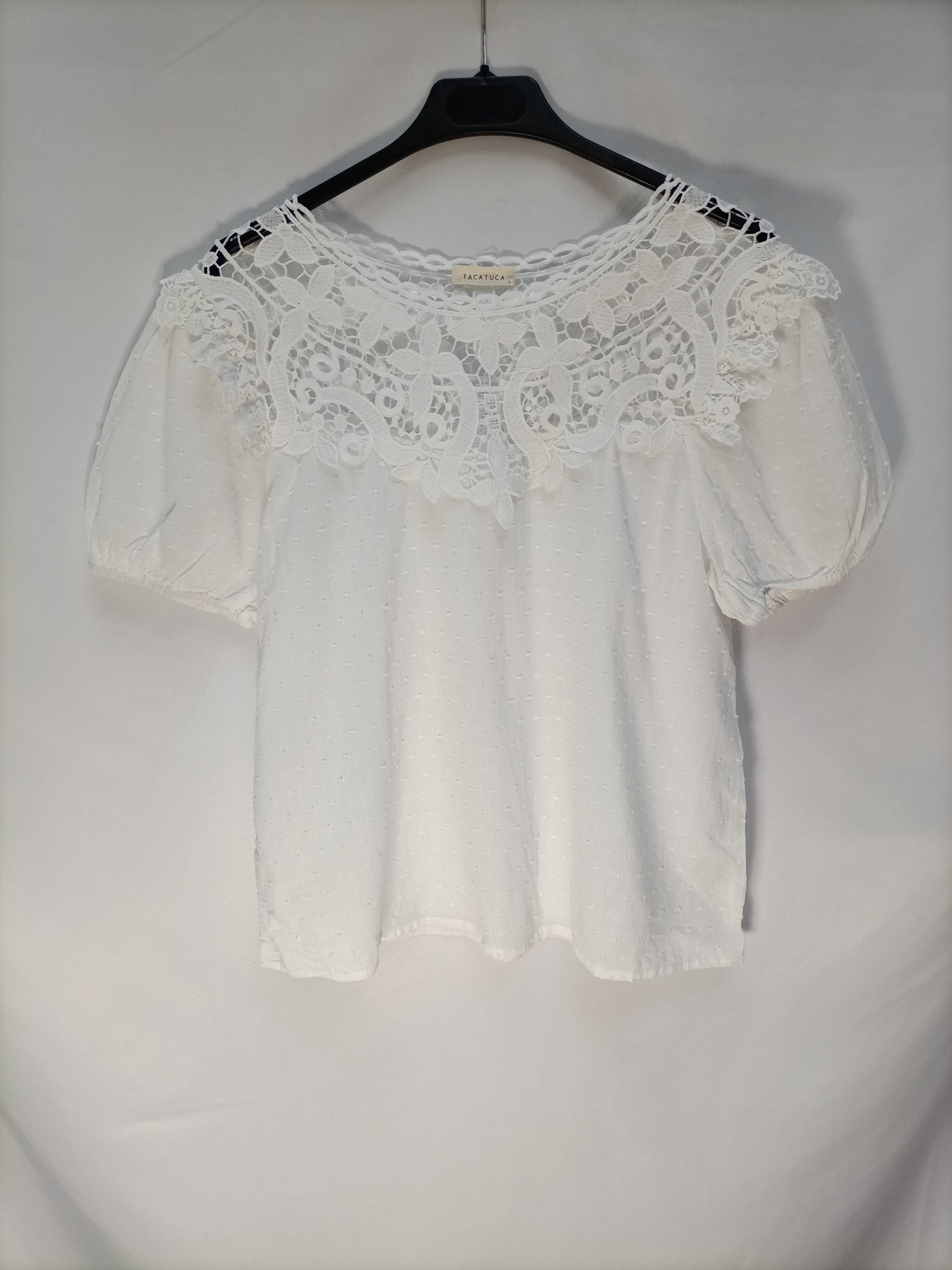 Blusa blanca de plumeti con el cuello troquelado de encaje. No elástica. De sisa a sisa 49 cm largo 55 cm