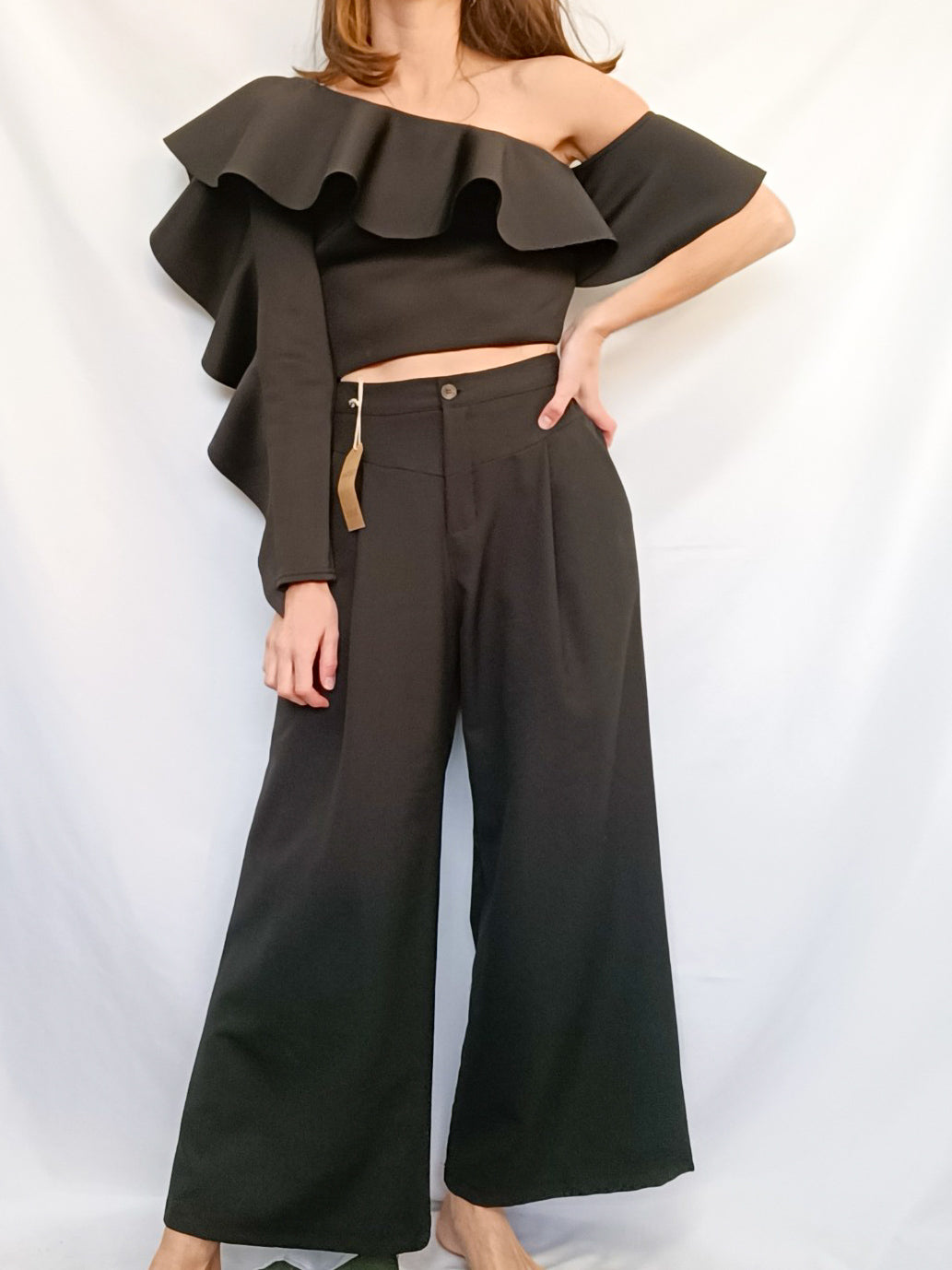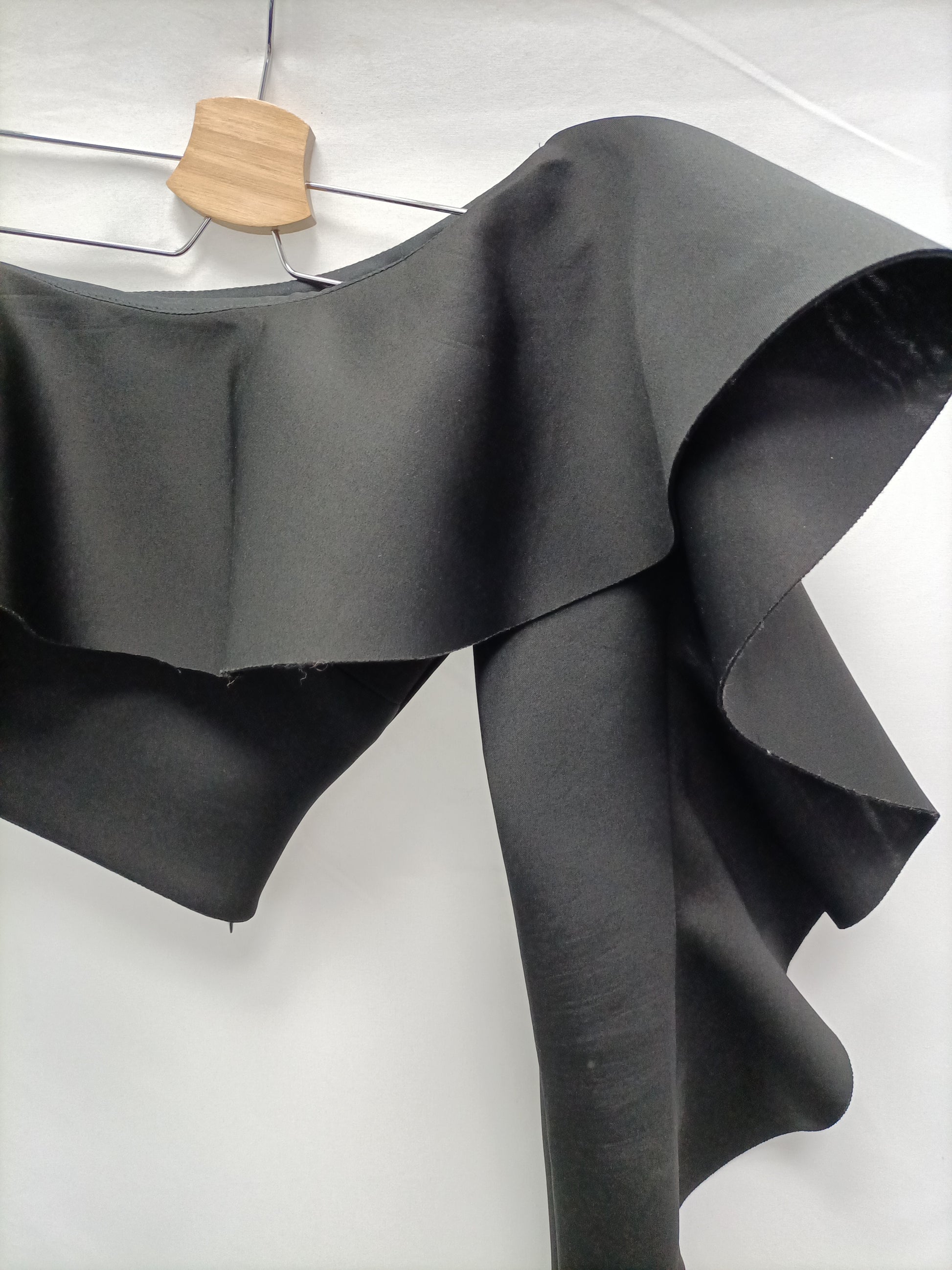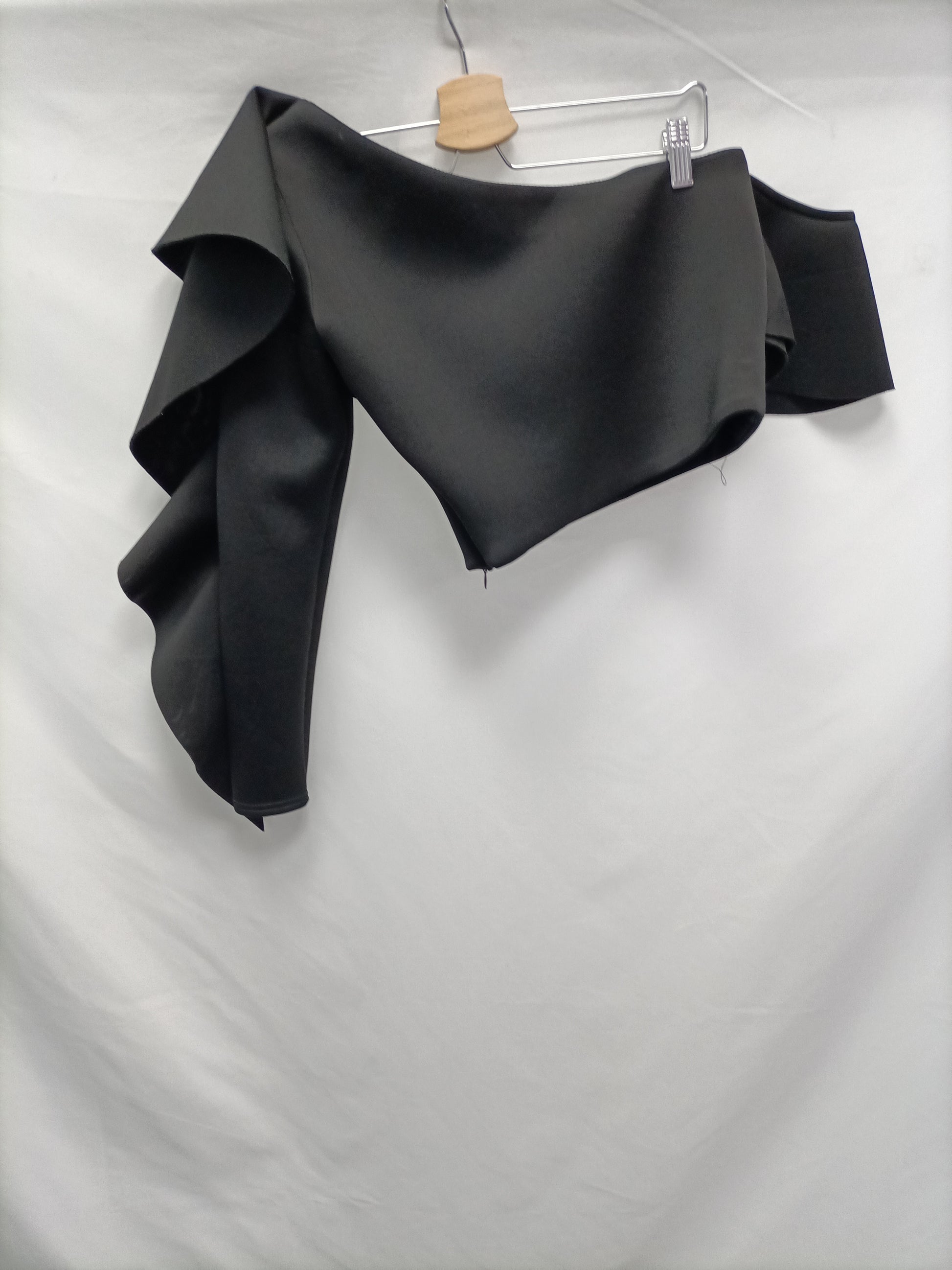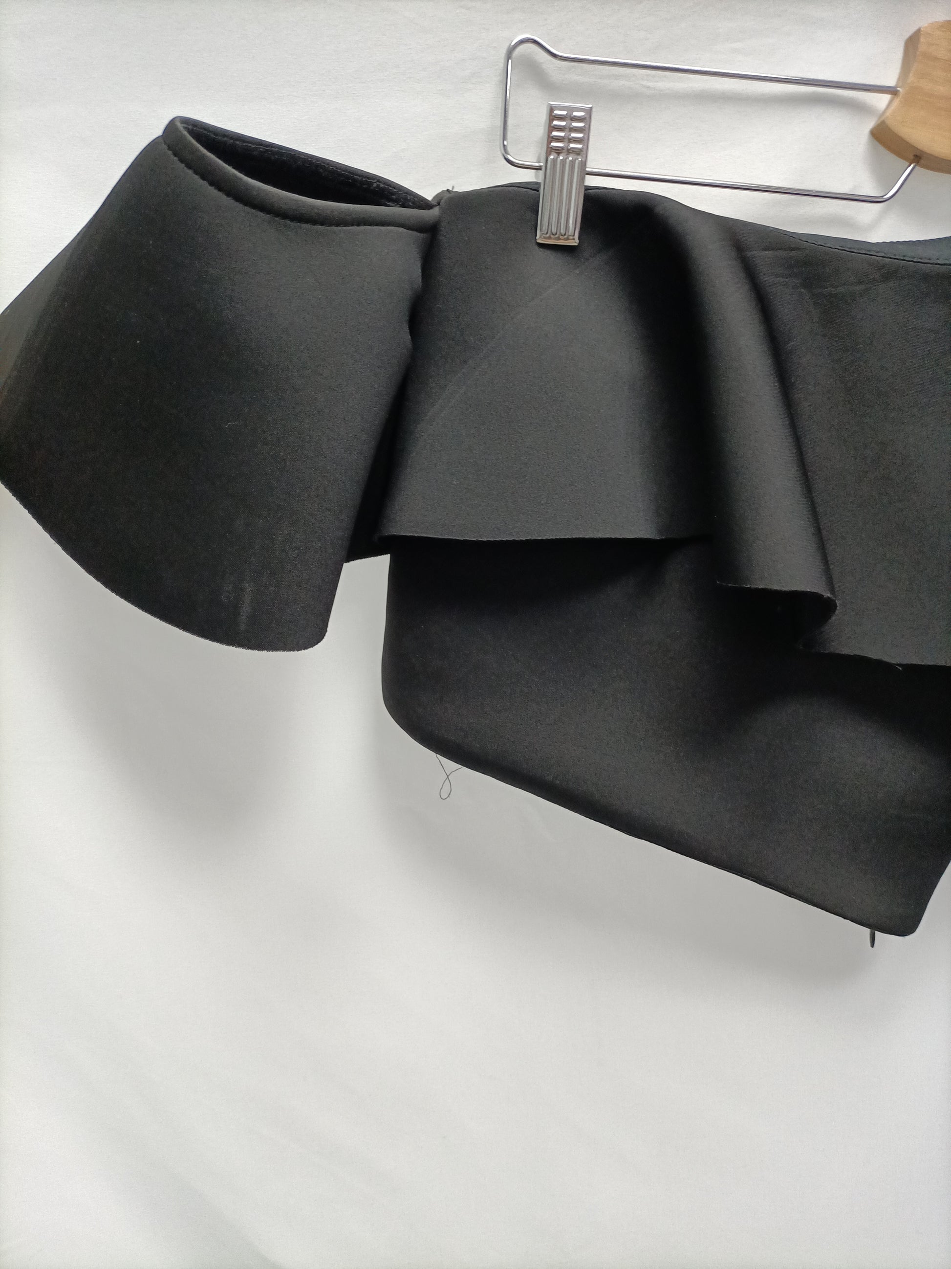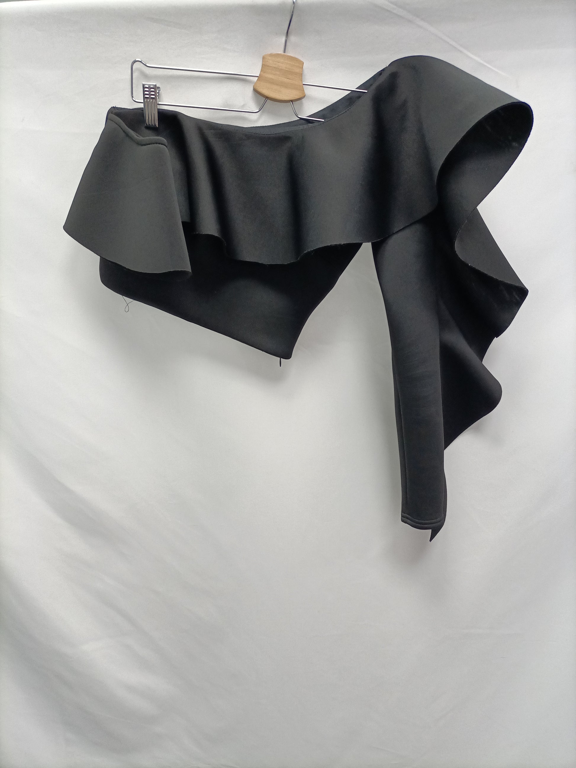 Top negro asimétrico de tejido estilo neopreno. Manga larga con volante y manga corta estilo volante. Elastico. largo 42 cm