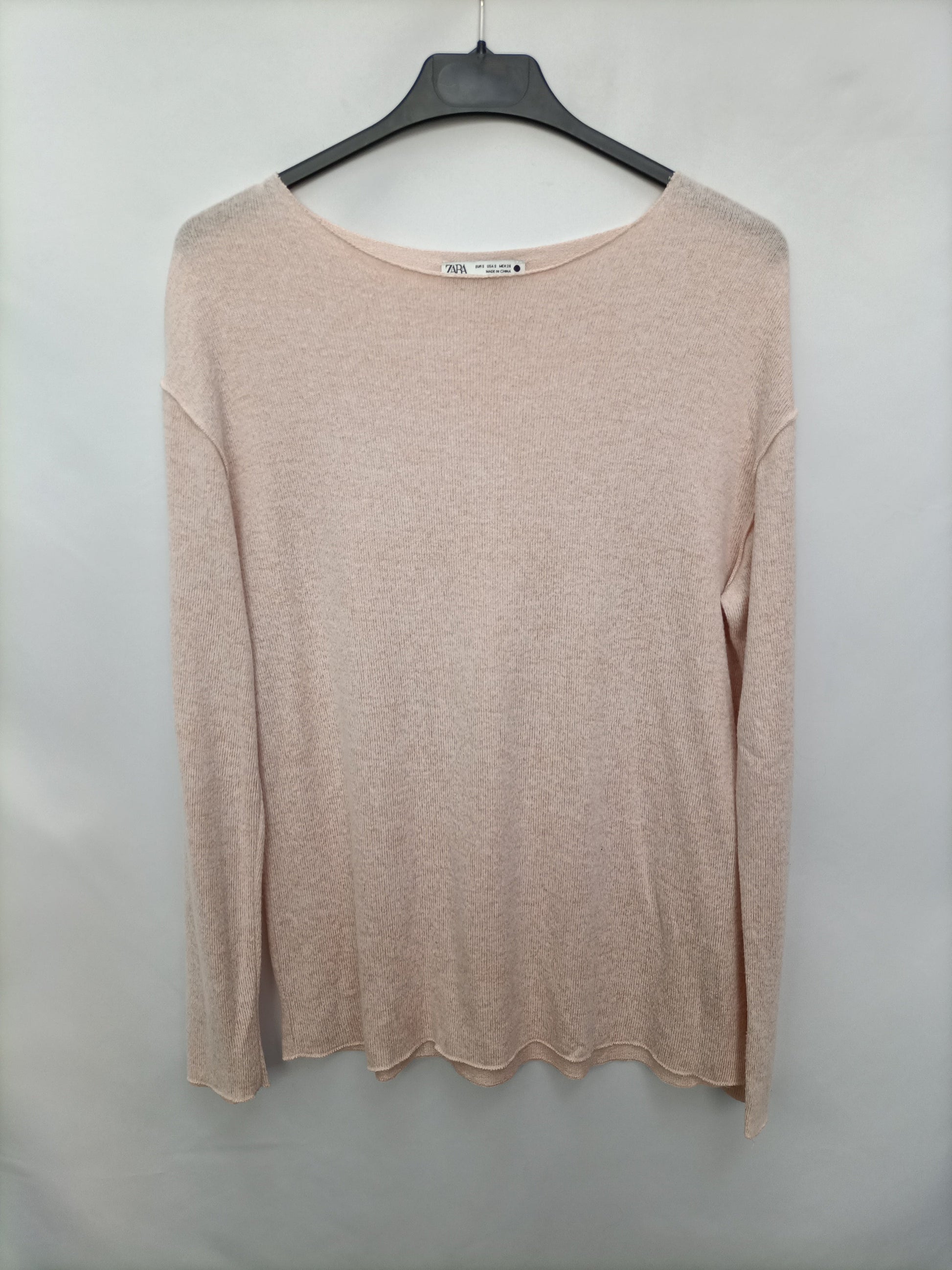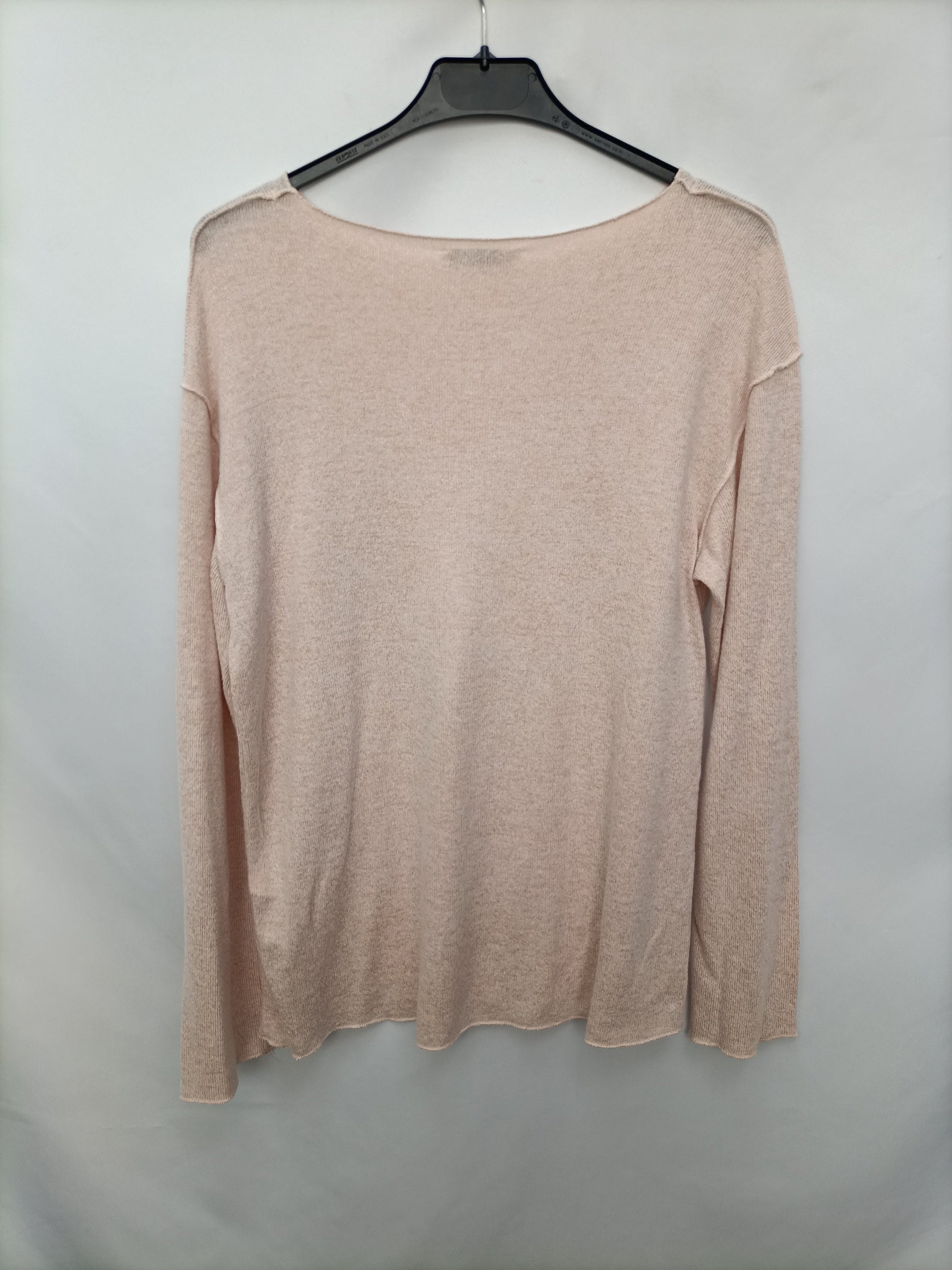 Jersey finito jaspeado rosa y blanco. Cuello amplio. Fluido y elastica. largo 61 cm.