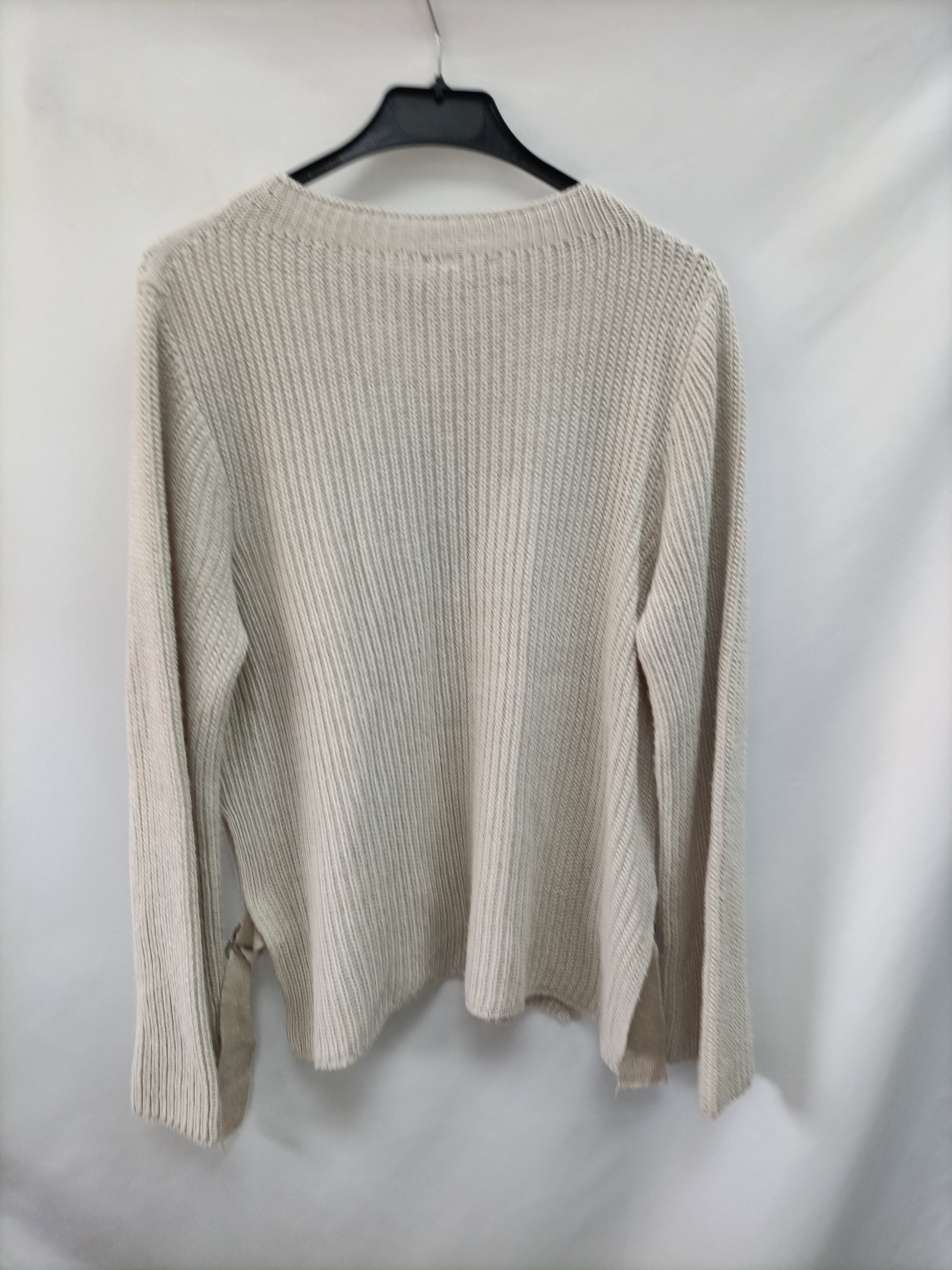 Jersey de punto beige con detalle de apertura mini lateral con hebilla. Largo 60 cm