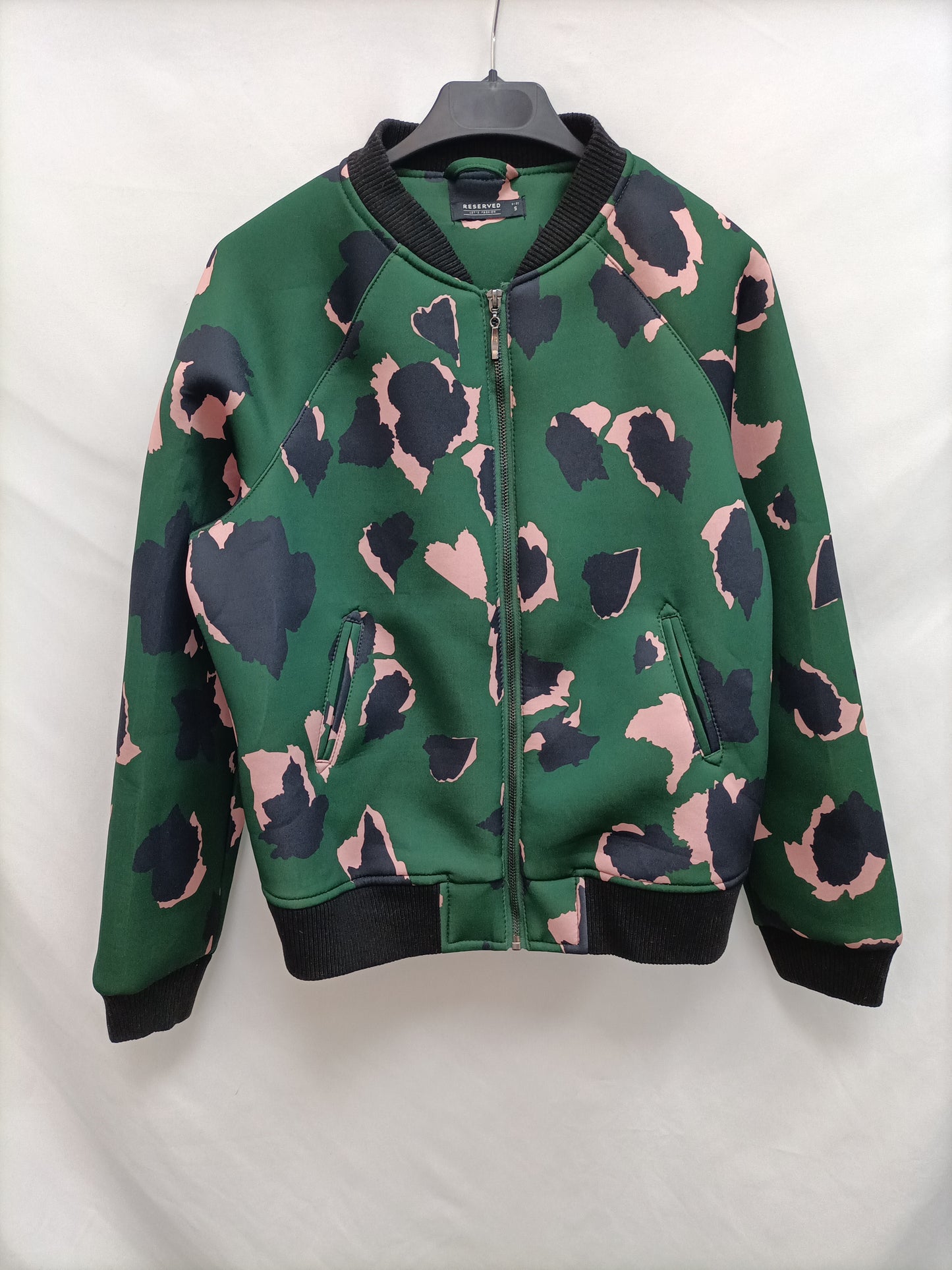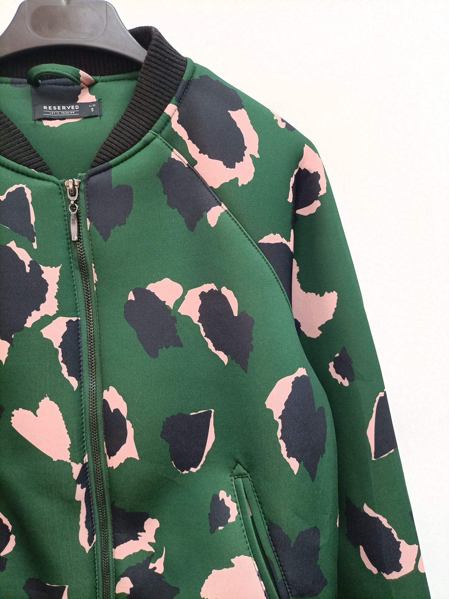 Bomber verde estampada de tejido de neopreno. Largo 57 cm
