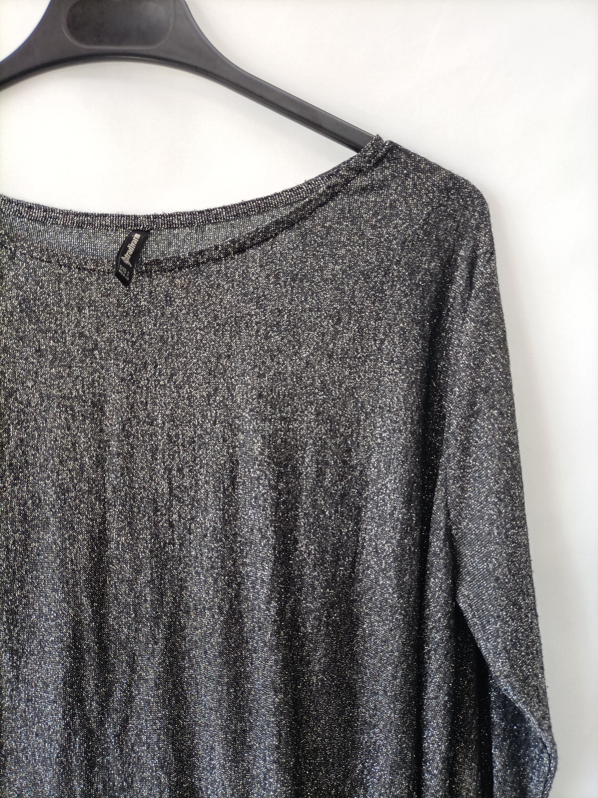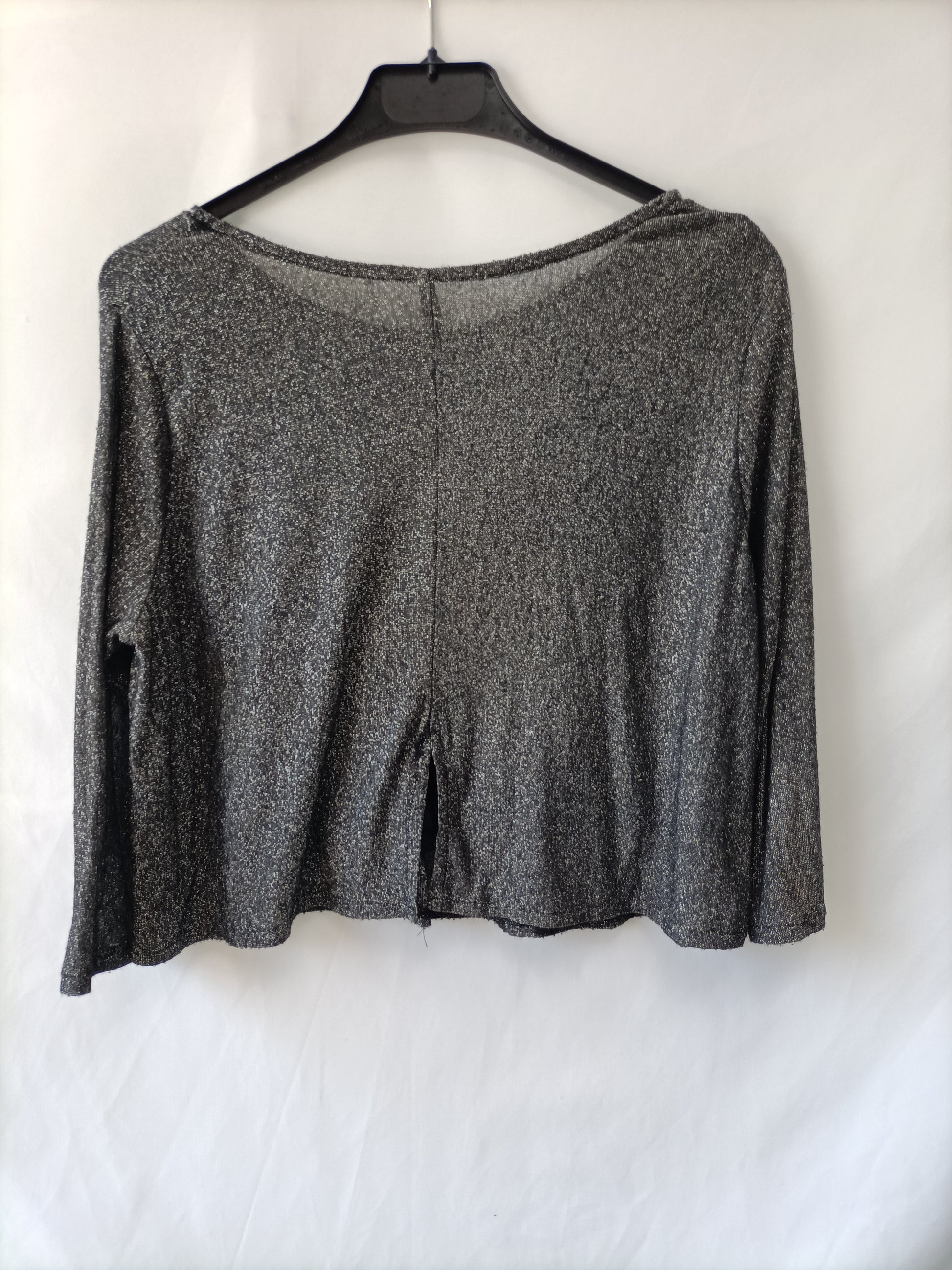 Top negro fluido con estampado de hilos plateados. Forro interior. Fluido y elastico. Largo 41 cm