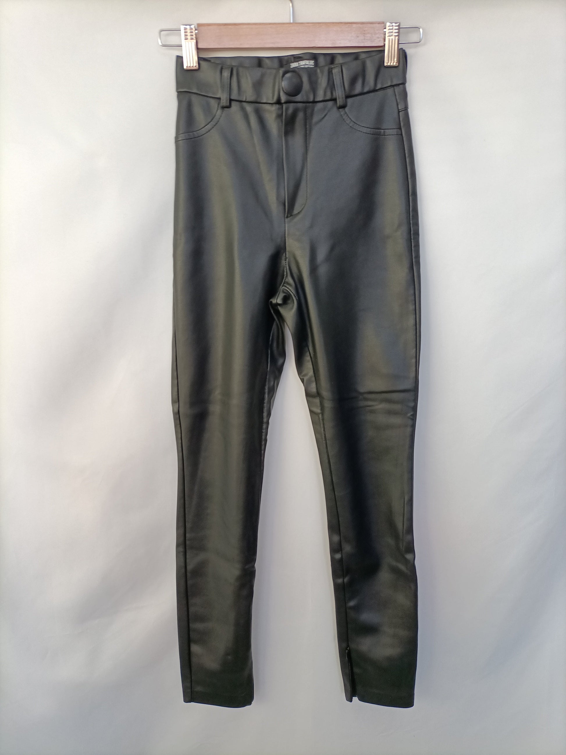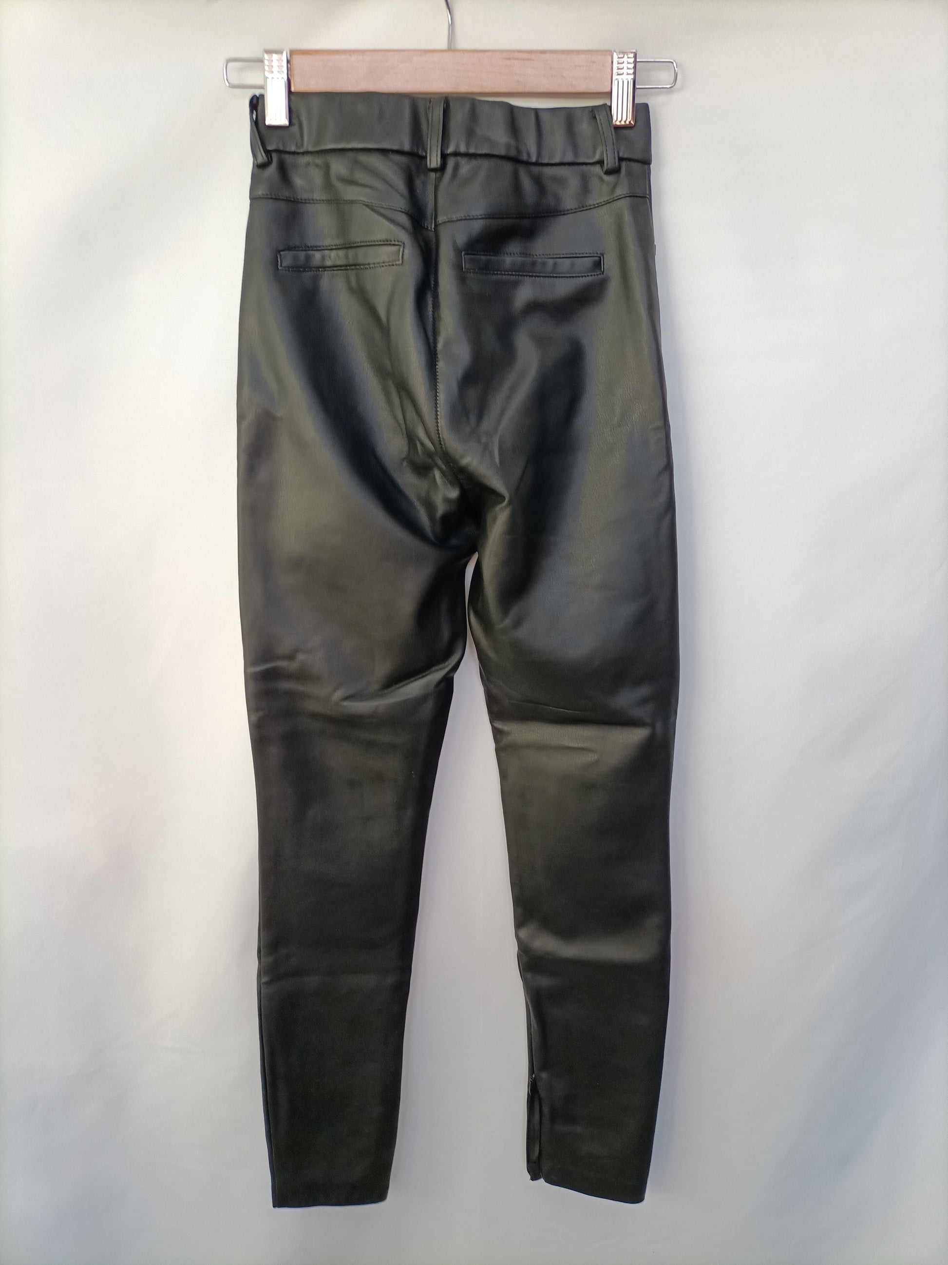 Pantalón estilo leggings negros de polipiel con botón. Detalle de cremallera en los tobillos. Muy ajustado. Semielastico. Cintura 29 cm Largo 96 cm