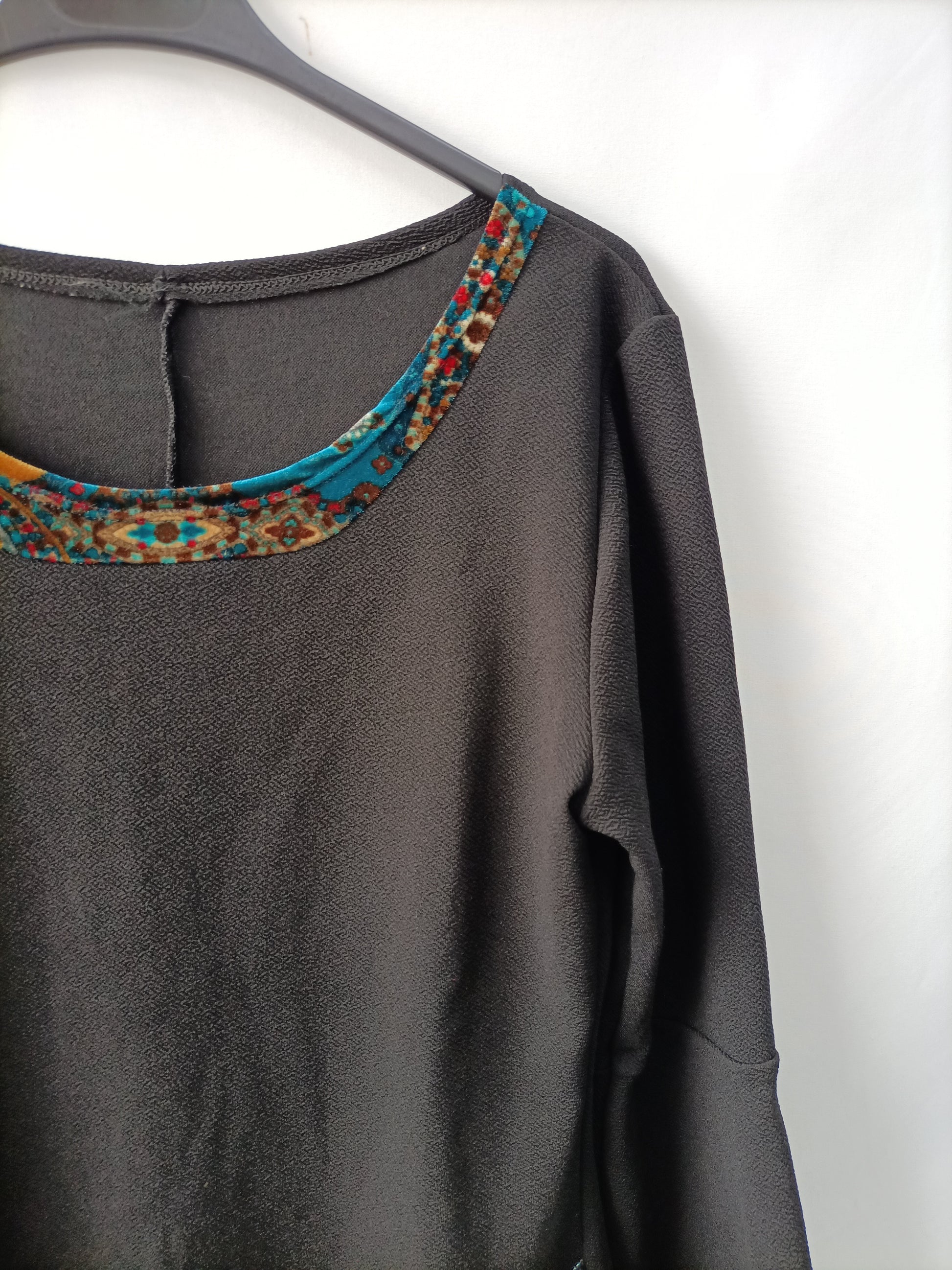Vestido negro elástico con detalles en terciopelo estamopado. Largo 77 cm