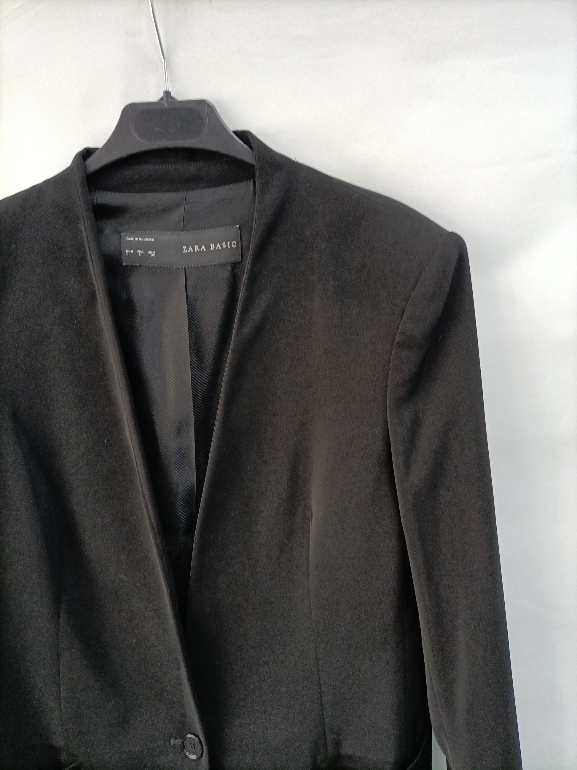 Blazer negra fluida con hombreras. Se abrocha con un botón. No es elástica. De sisa a sisa 45 cm largo 72 cm