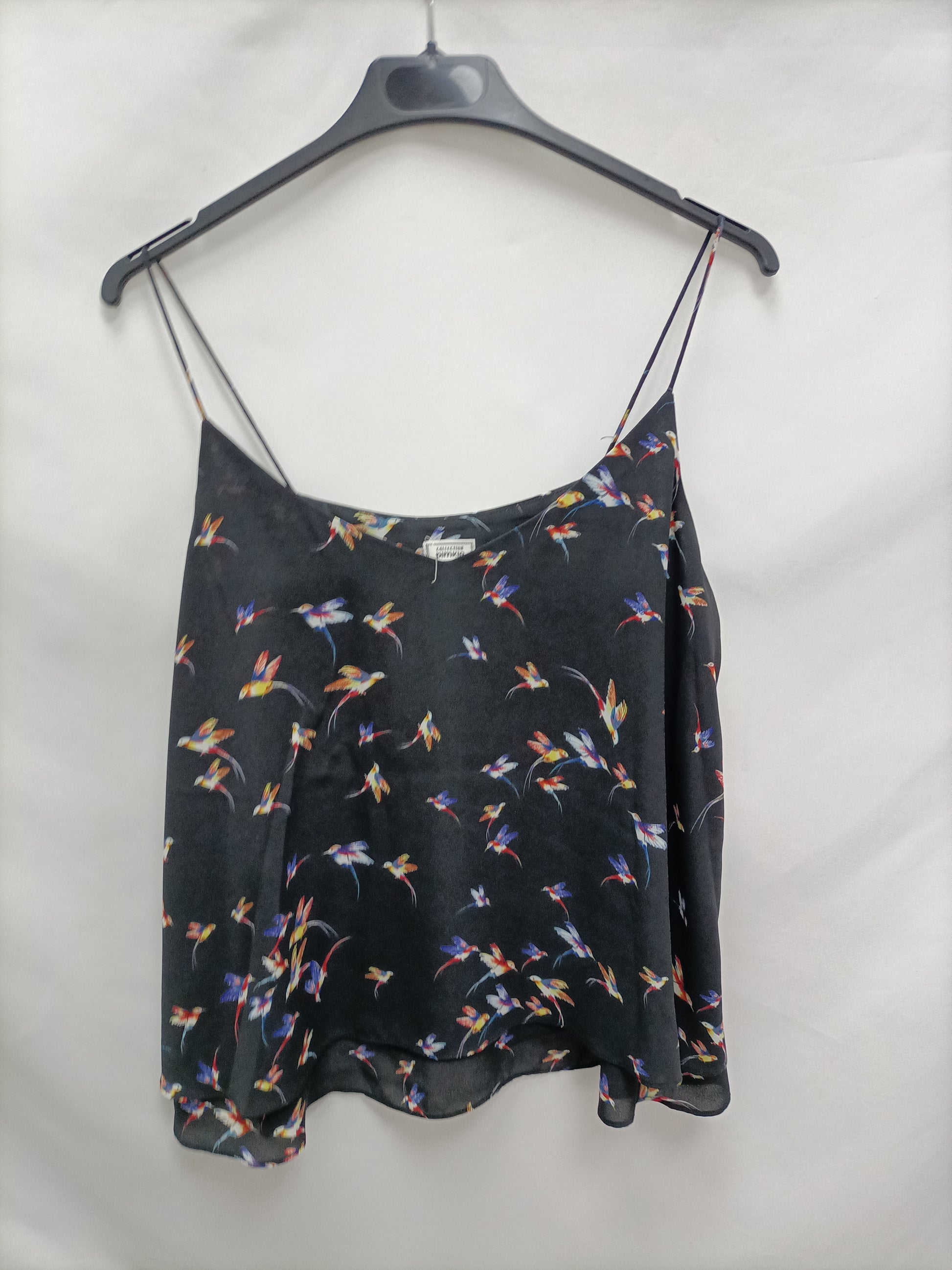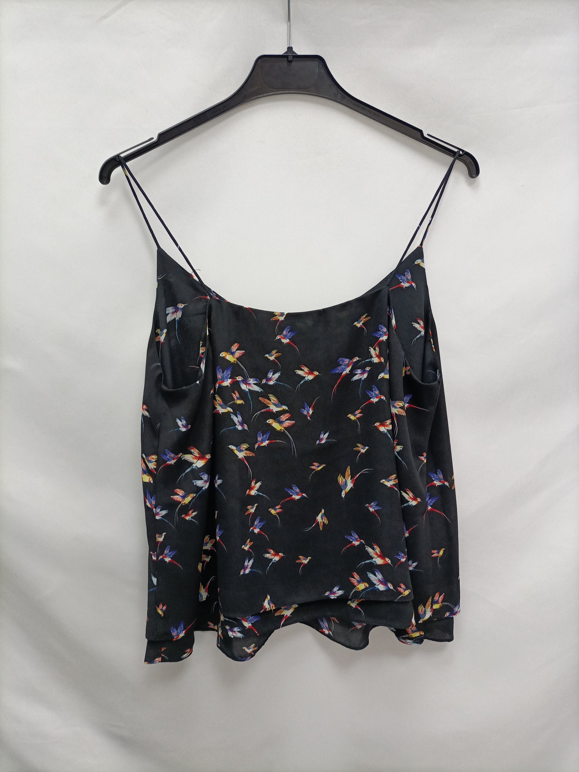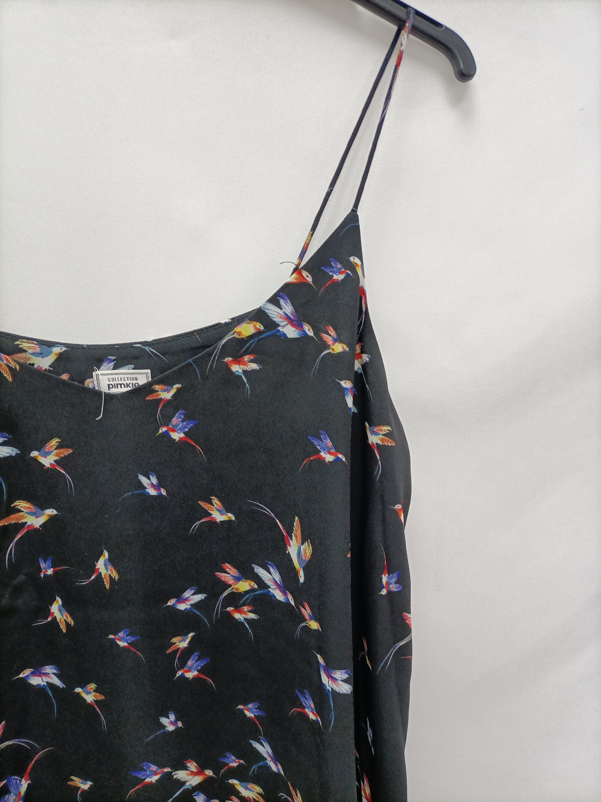 Top negro de tirantes con estampado de pajaros. No elastico. De sisa a sisa 48 cm largo 53 cm