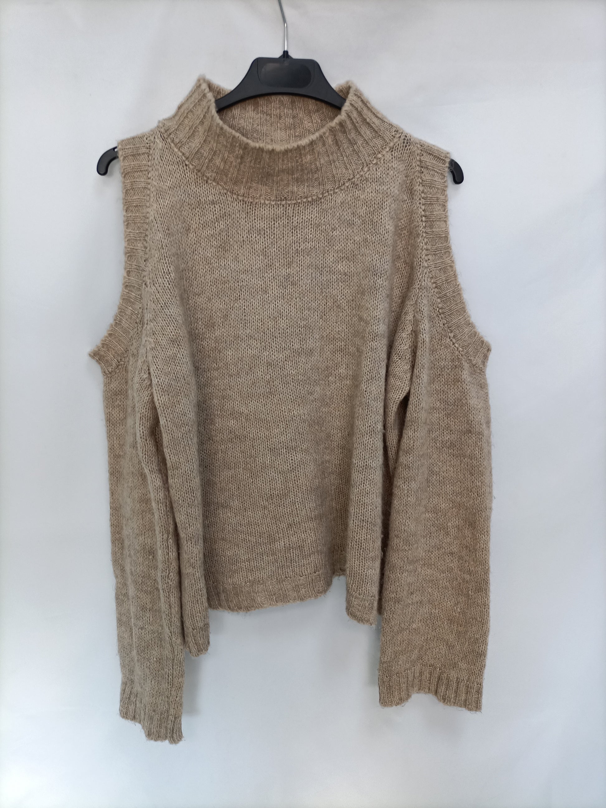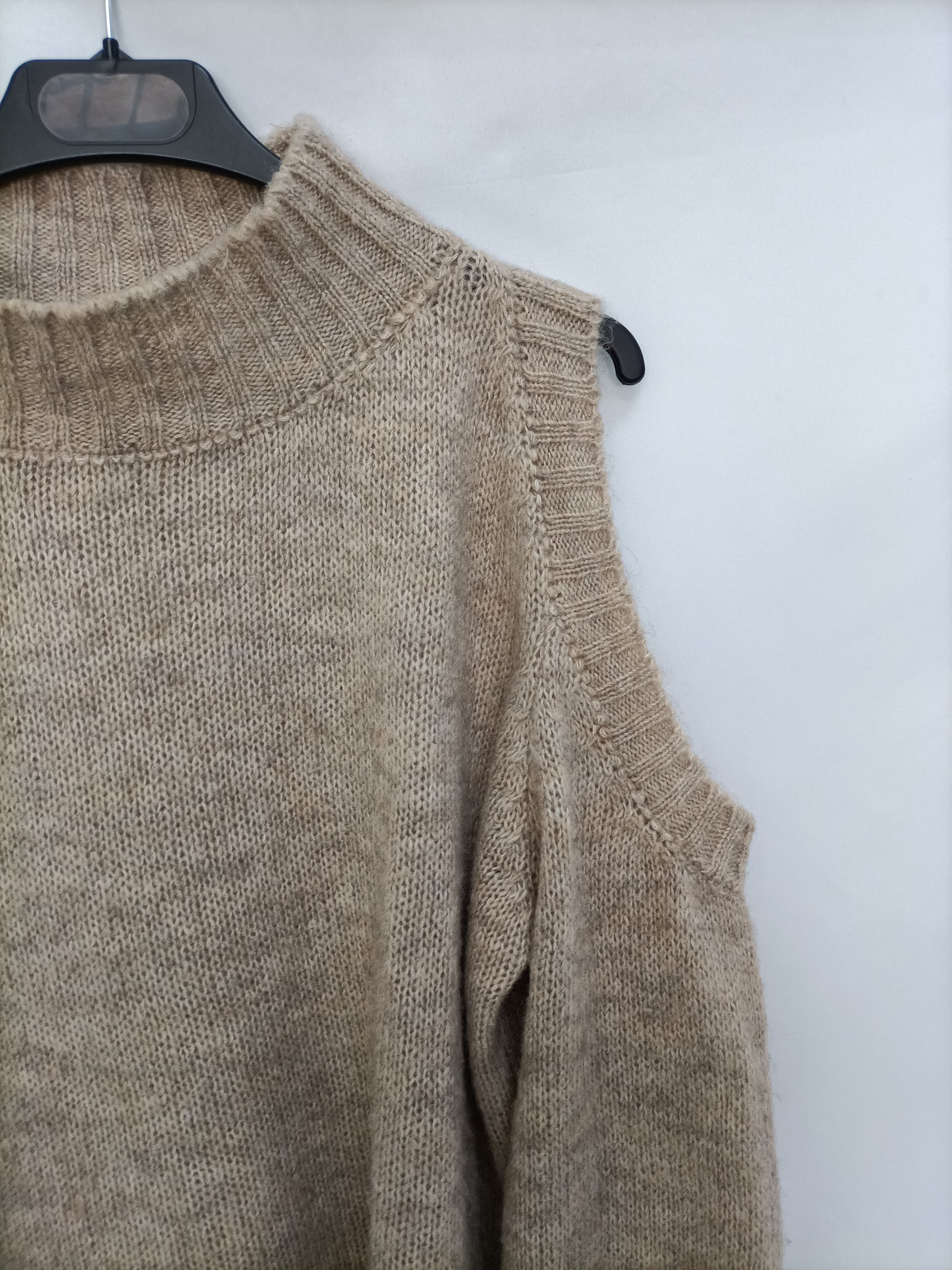 Jersey jaspeado beige con detalle de hombros al aire y mangas acampanadas. Largo 58cm