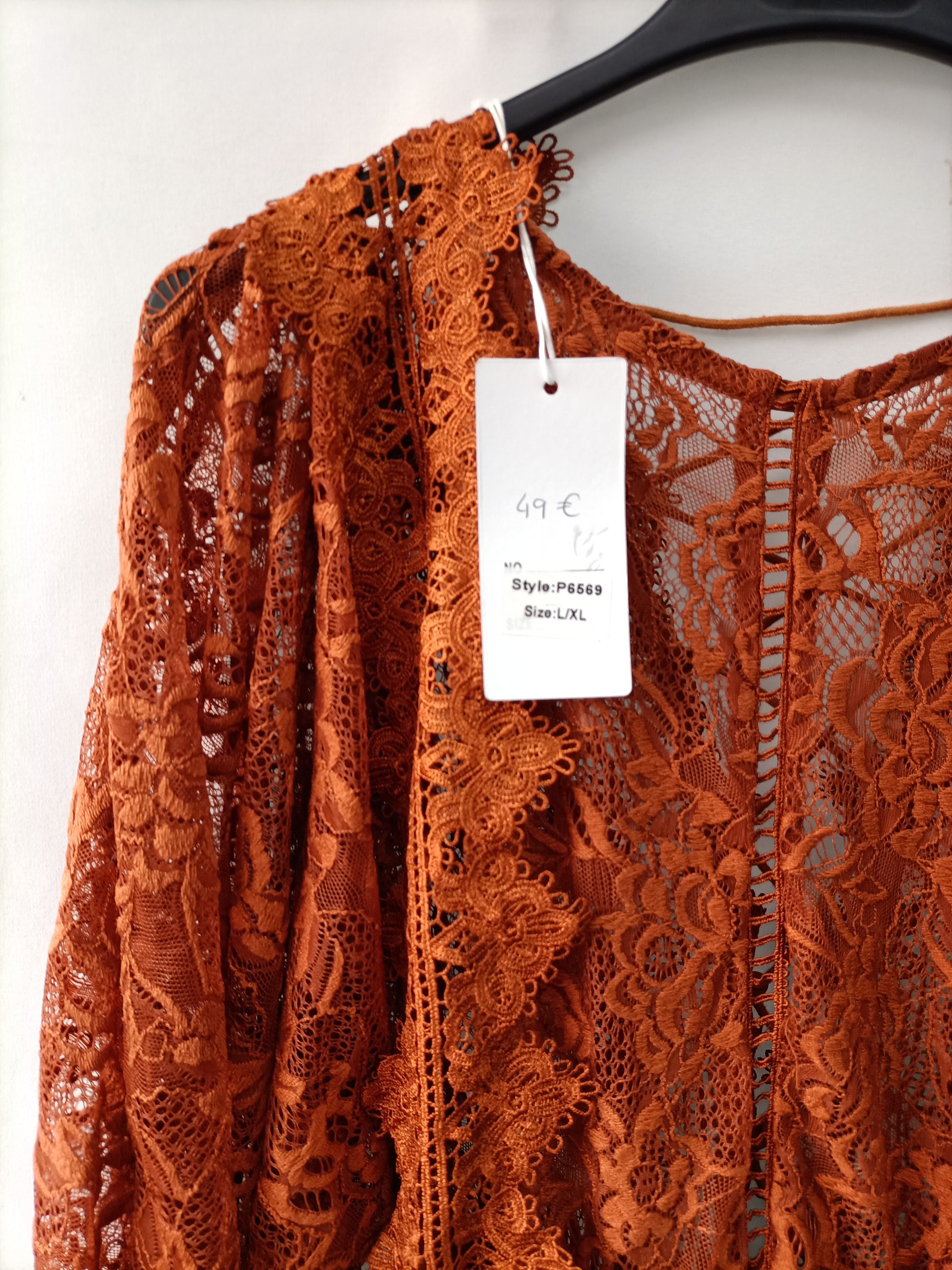 NUEVO CON ETIQUETA. Vestido corto de encaje color teja con espalda abierta con cuerdas. Largo 88 cm