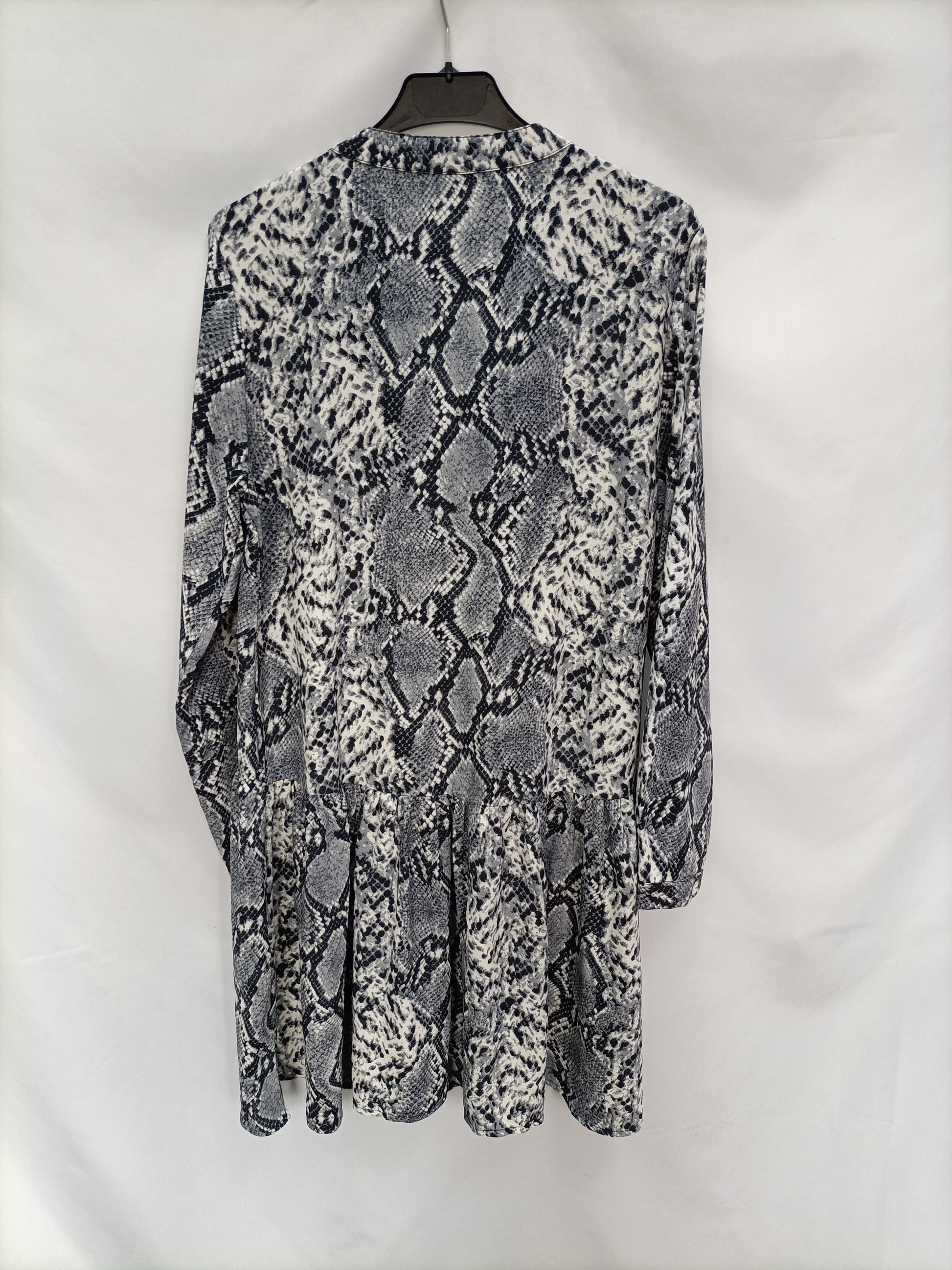 Vestido corto animal print gris y beige fluido. Estilo oversized con volante largo en la parte de abajo. No elastico. De sisa a sisa 52 cm Largo 94 cm